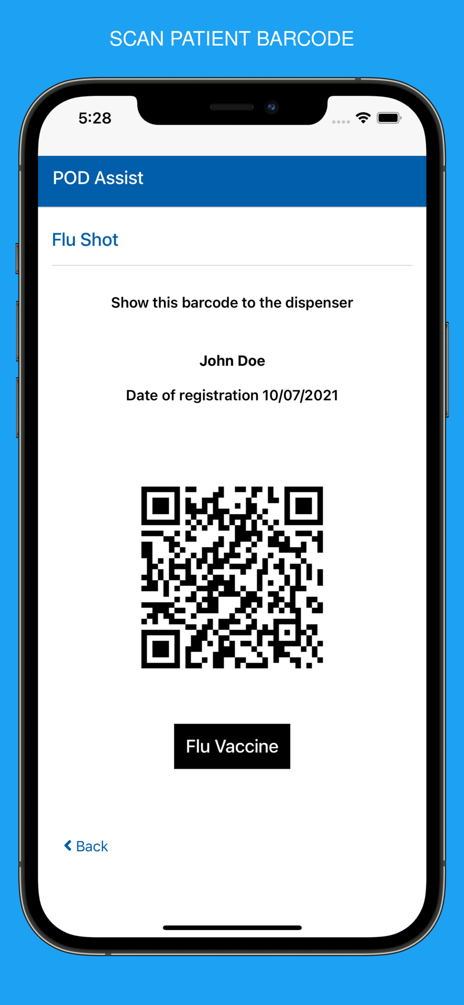 Staff supporting a point of dispensing (POD) that are responsible for dispensing countermeasures can use the POD Assist app to scan barcodes of individuals who have registered to receive countermeasures. After scanning the registration barcode, POD Assist will display what countermeasure the individual should receive based on the information they provided when they registered. POD Assist also allows POD staff to scan the barcode of the countermeasure being dispensed to rapidly collect the lot number. Once this information has been collected, the data is sent to POD Assist and the POD staff can continue the process of scanning barcodes and dispensing countermeasures for individuals at a POD.