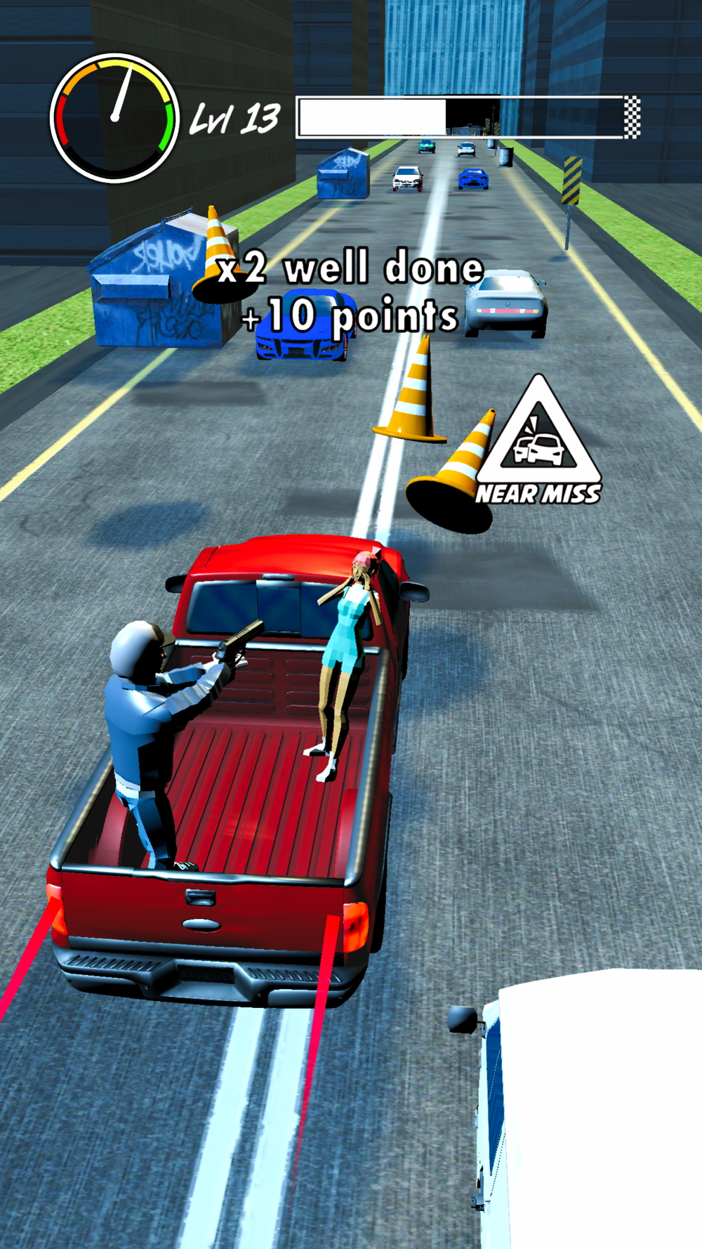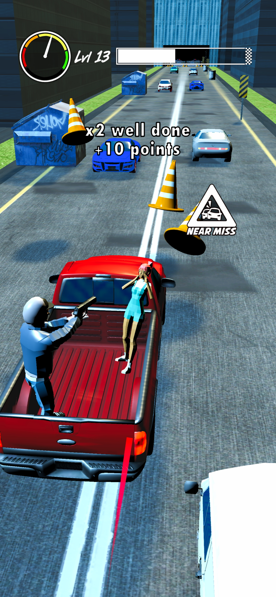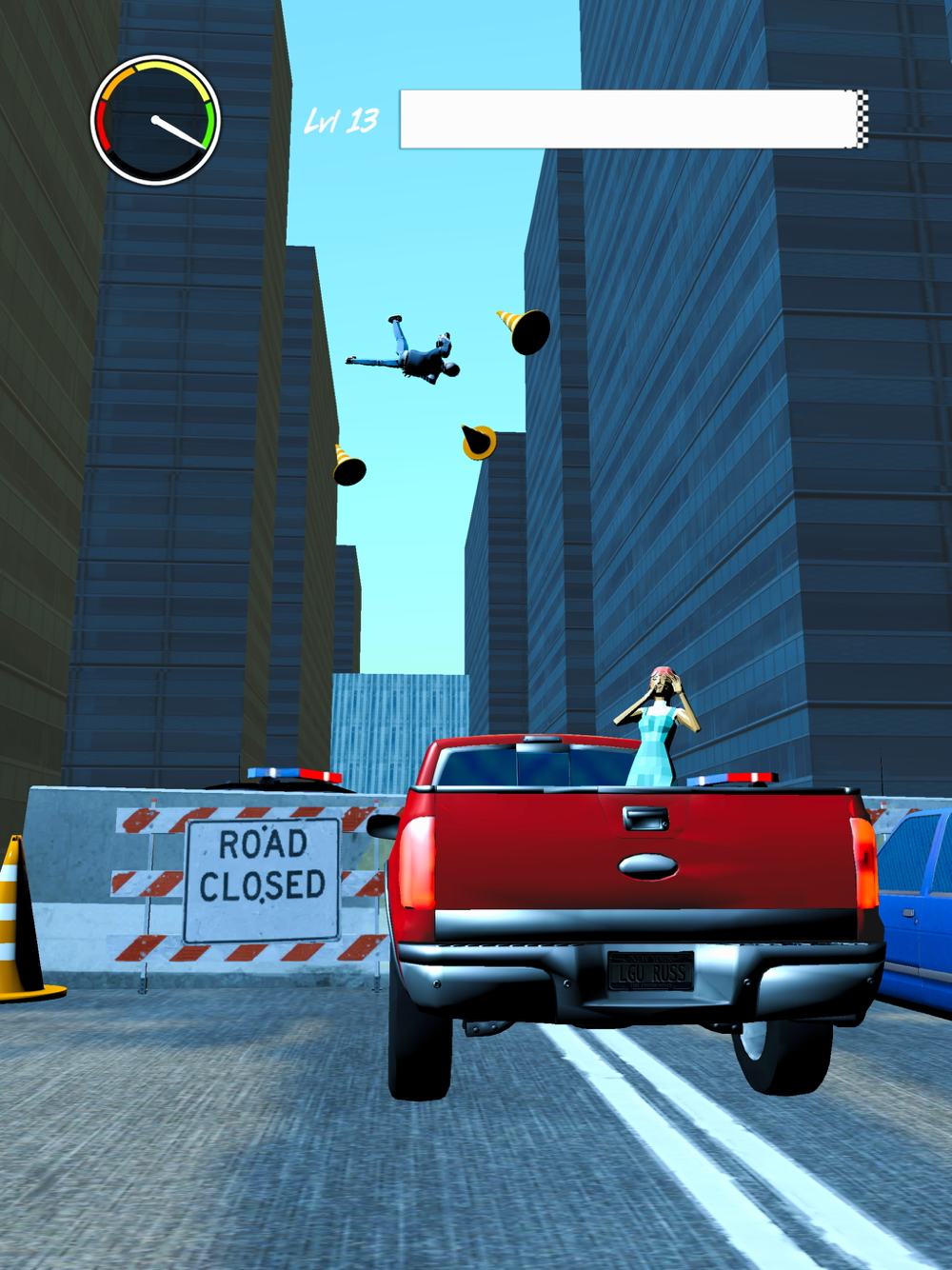 Control the car by dragging. When you get fast enough and come to the police barricade, crash the car. The robber will fly. If you pass near cars, your speed will increase. But be careful not to crash into other cars.