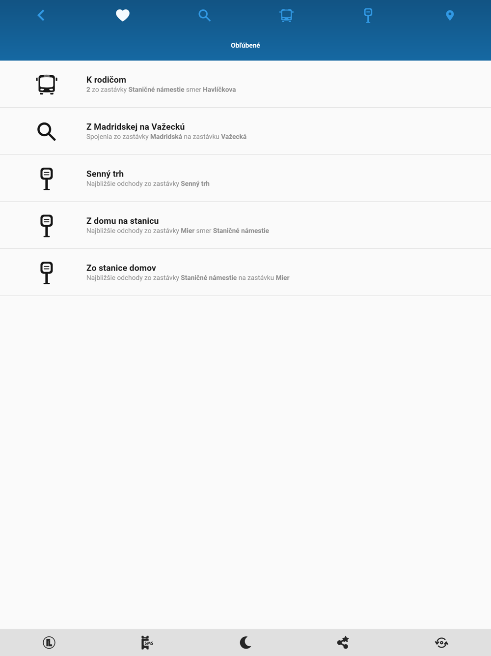 Ulož si obľúbený Bus alebo obľúbenú Zastávku, z ktorej často cestuješ. Odpočet ti ukáže koľko ti ostáva do odchodov obľúbených busov. Ak zmeškáš, nevadí, odpočet začína znova pre nasledujúci spoj. Navyše ak nestíhaš, môžeš si kúpiť aj SMS lístok. O aktuálne cestovné poriadky sa aplikácia postará sama, preto ťa už nezaskočí žiadna zastávka s prelepeným oznamom ;) K dispozícii je aj zobrazenie polohy autobusov/trolejbusov, zastávok a trás liniek na mape. Aplikácia upozorní aj na prípadne výluky a oznamy dopravného podniku.