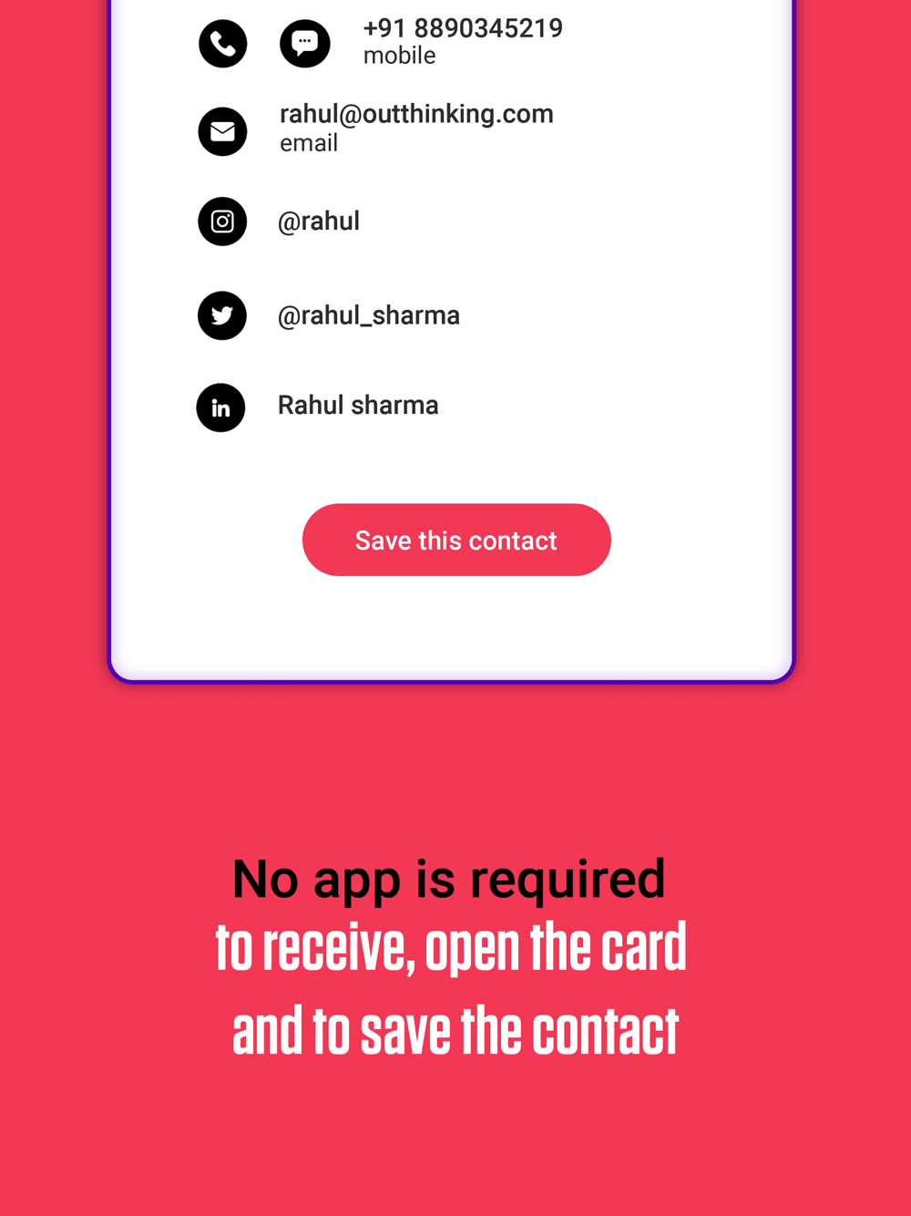 - QR Code - your client can get your digital visiting card by pointing his phone camera onto your QR code by using our in build QR code scanner