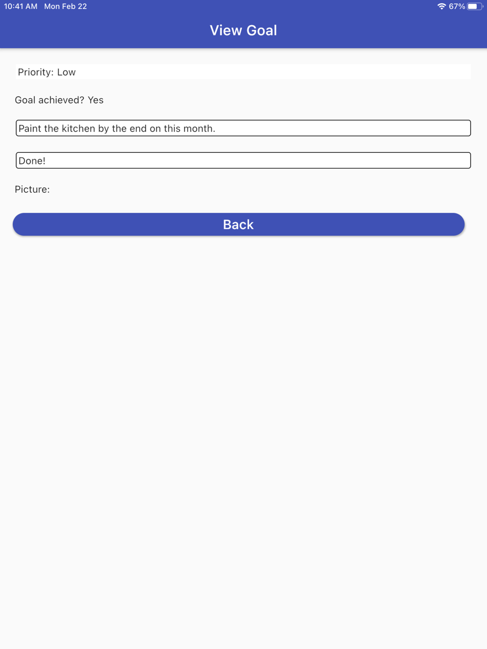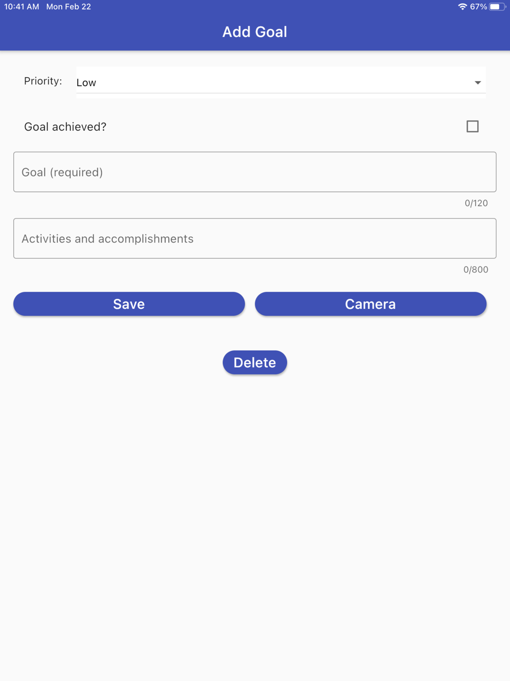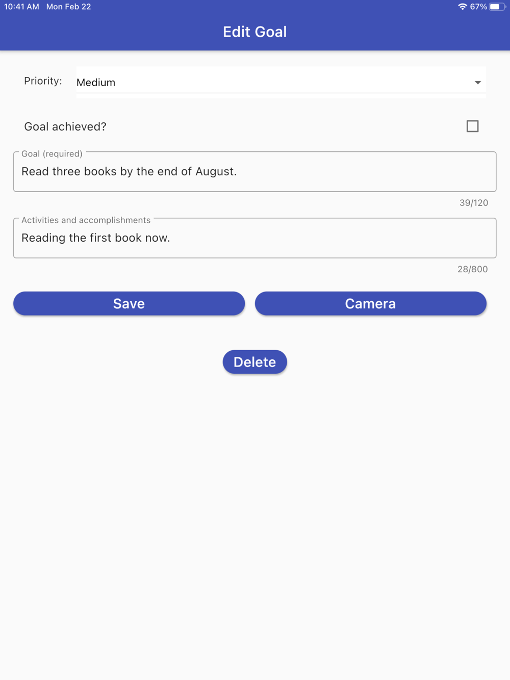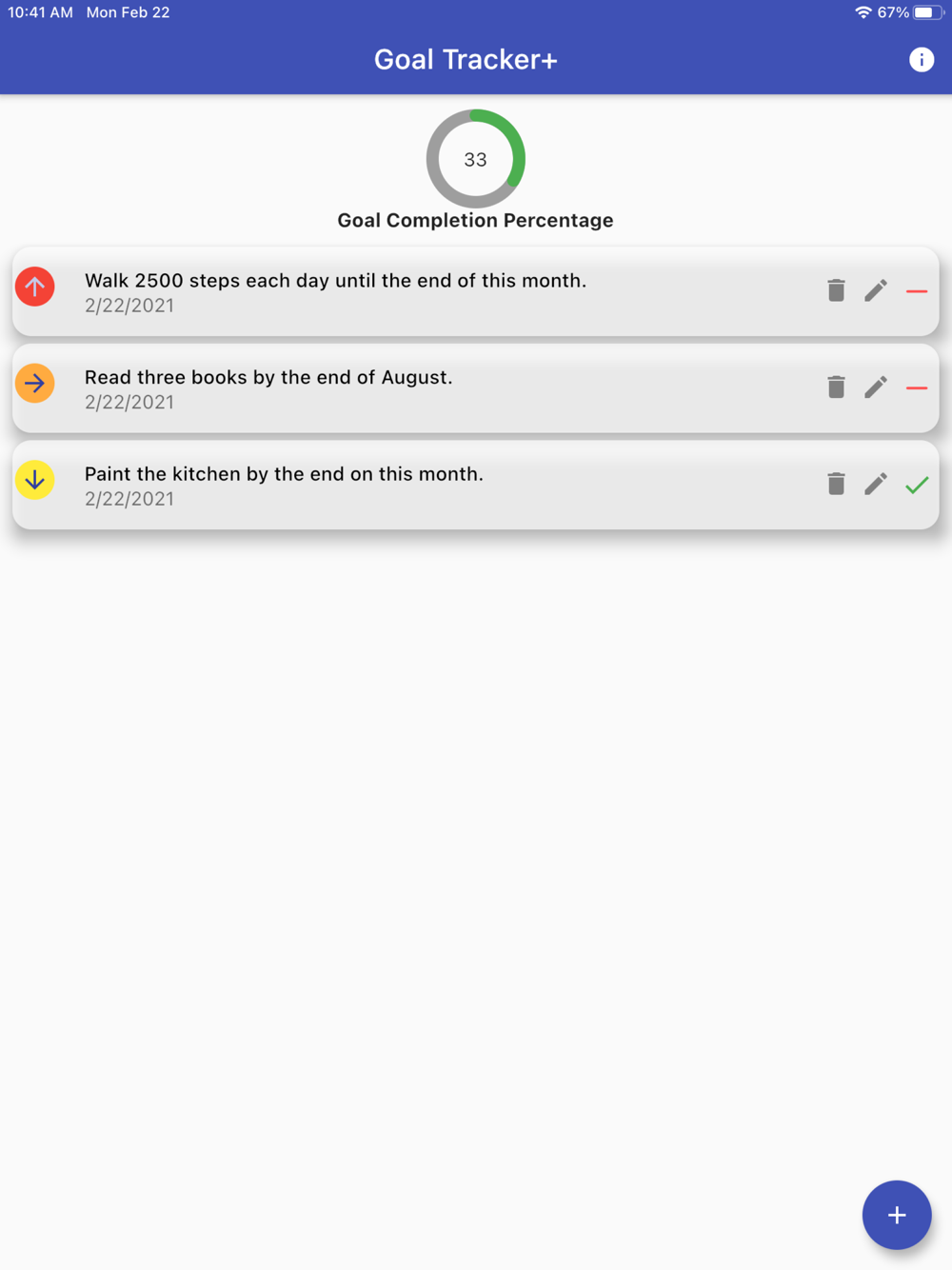 Goal Tracker+ allows you to easily record and track your goals and accomplishments. A photo can be added to each goal! Goals can be marked as completed and shown by a percentage completion indicator.