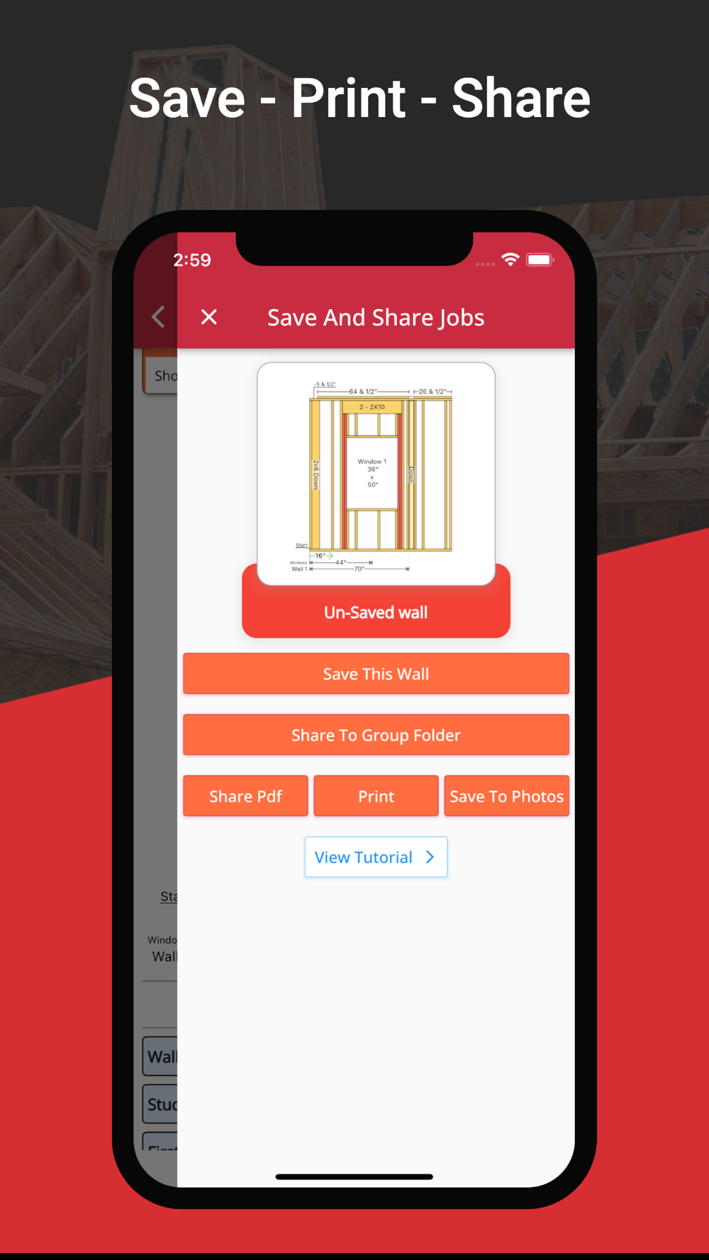 The app will give you every wall measurements, details and cut lists you need to build this wall. You can then save the walls to the app or to your photos where you can share the plans with your crew.
