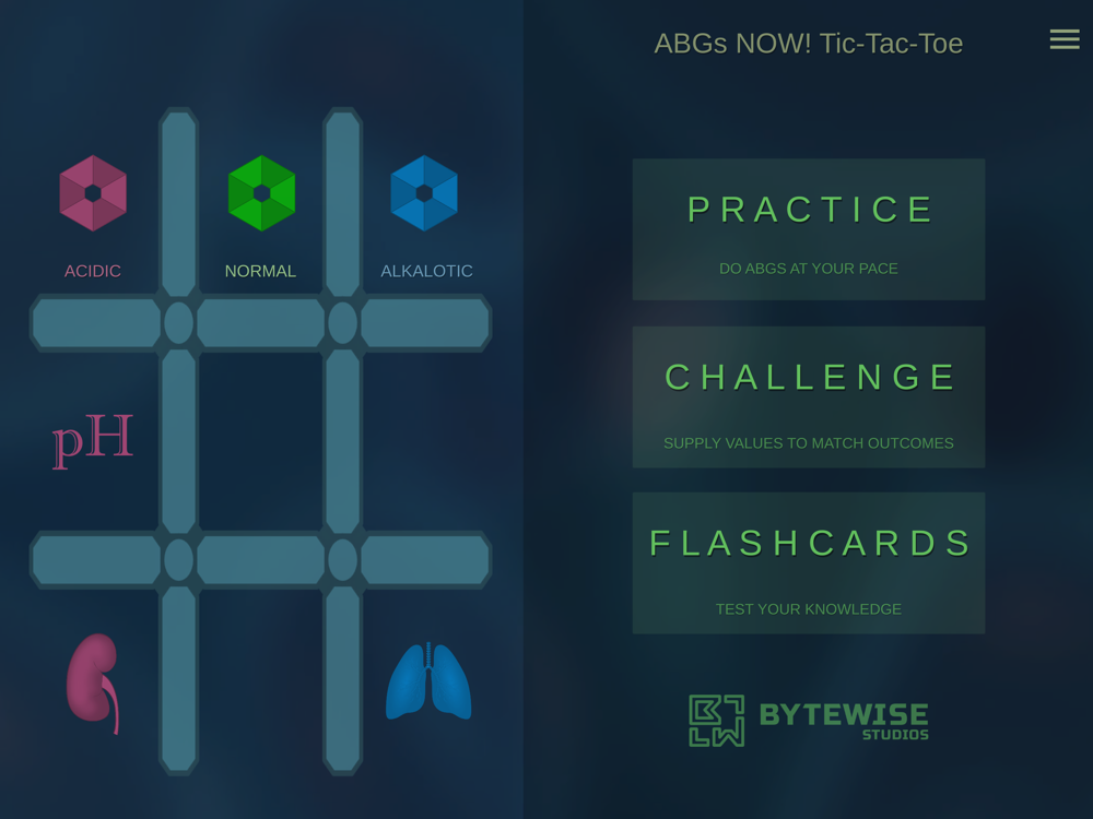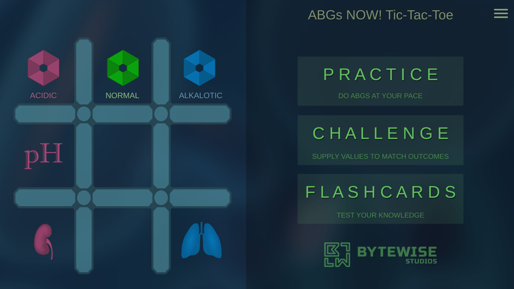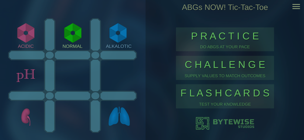 ABGs NOW! Tic-Tac-Toe is a fun, interactive way to learn arterial blood gases! It provides two modes, challenge and practice, that use helpful colors and icons to guide you through the tic-tac-toe method. The app has three modes to help you in your mastery of ABGs interpretations.