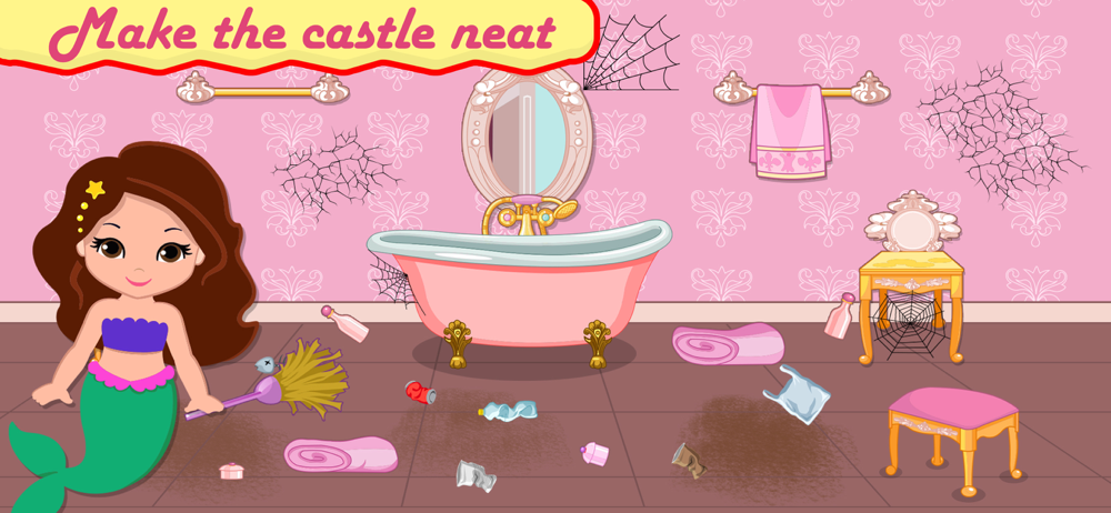 Let's clean up t! Spend a lovely time in this cleaning game where you get to help a beautiful mermaid princess to restore her royal home and make it look clean again. Before you begin your washing session you must know that there are multiple challenges coming. You will clean the royal princess castle, restore and decorate in different environments and each room has its issues, so be prepared to overcome any obstacles. Start the royal house cleaning in the living room area, then continue with the kitchen, the bedroom, and the exterior garden. You will remove the garbage, get rid of the dust and the stains on the floor. Right after you will decorate the mermaid princess castle like a pro designer and you will make it like a royal doll house.