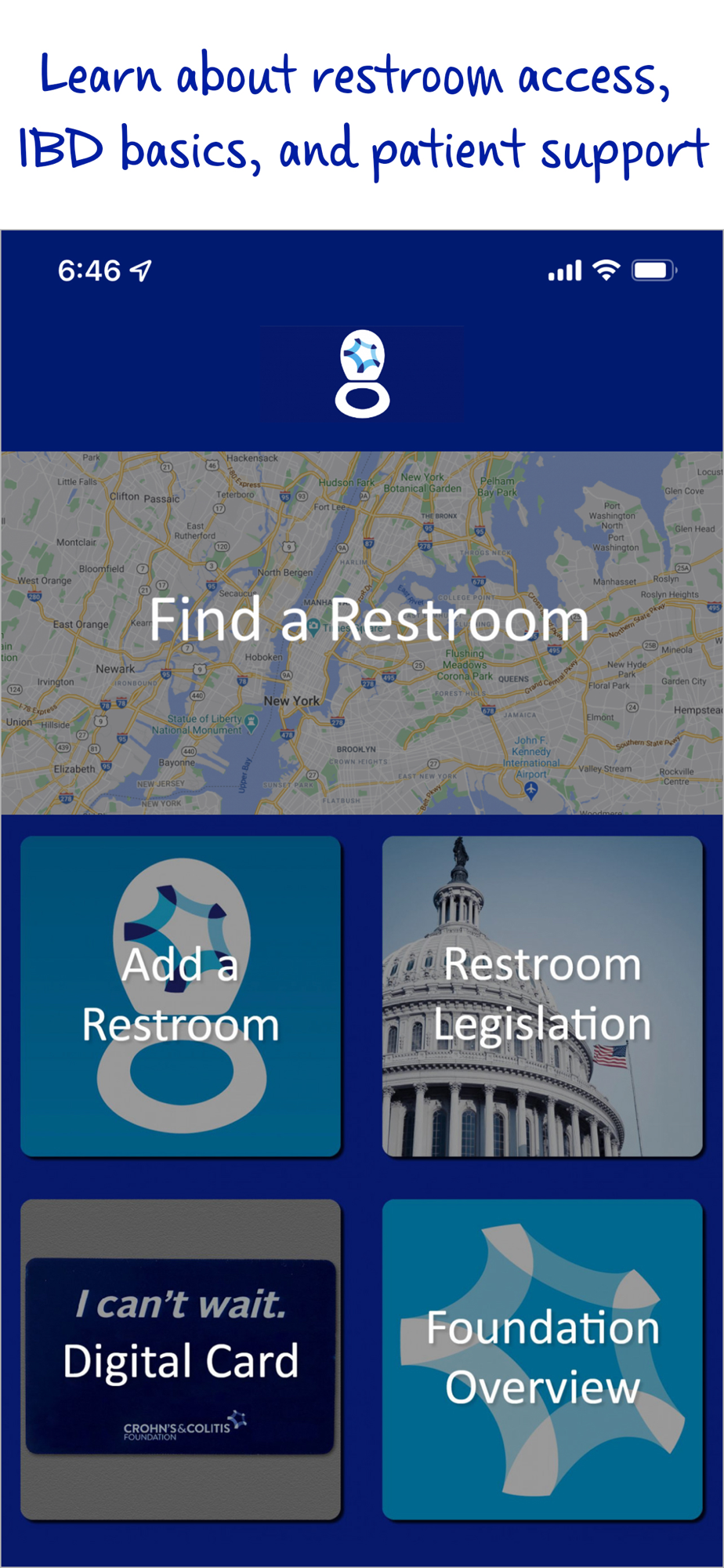 This app also provides education and resources for those looking for IBD support and information, and information on the status of restroom access legislation in each state.