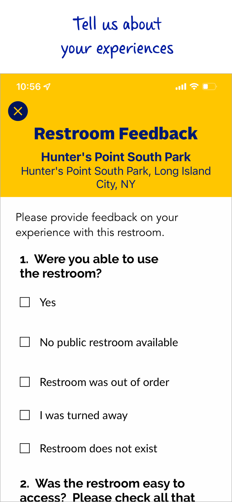• Crowdsourced restroom information (contributed by users)
