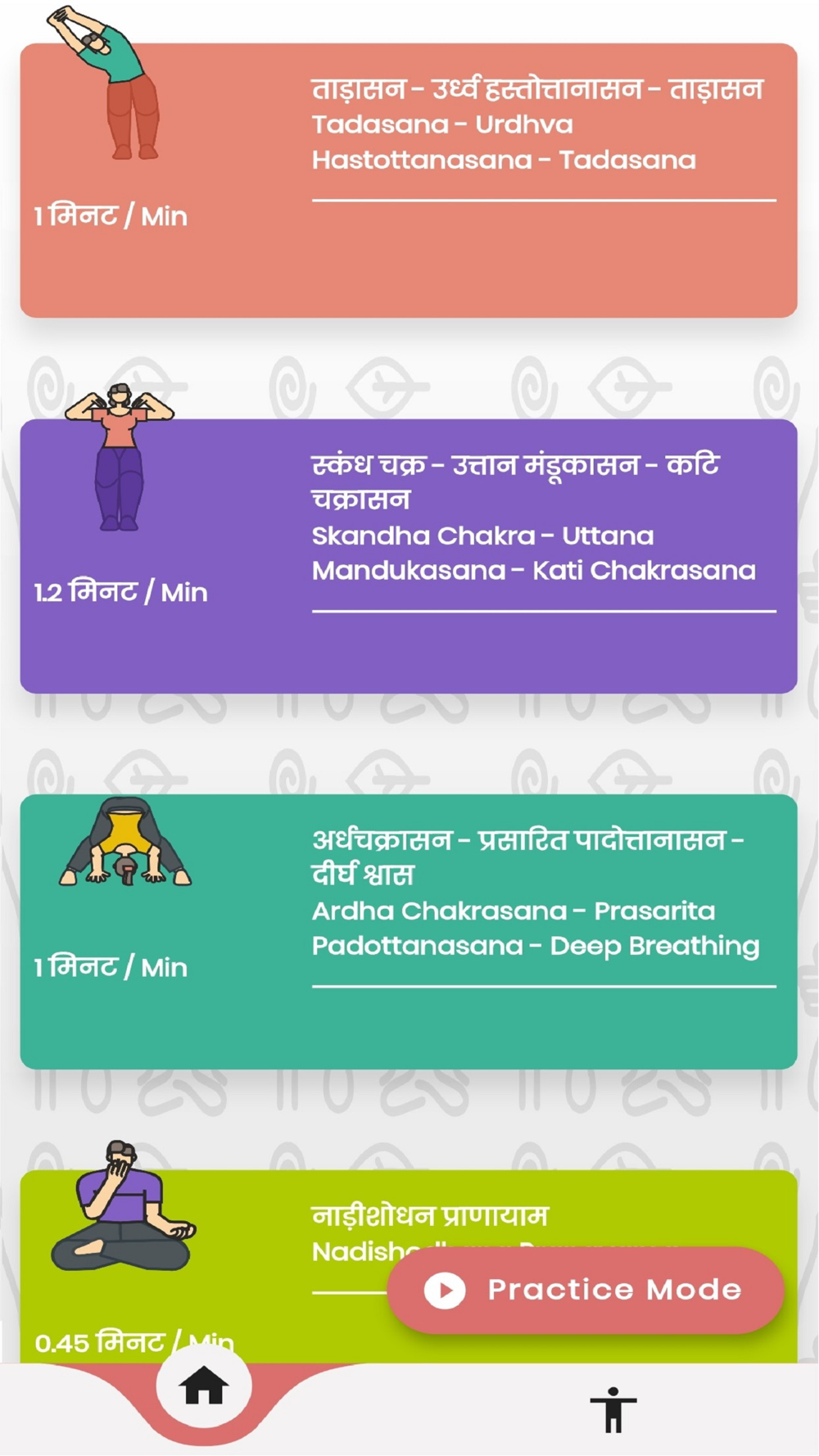 ● In the first minute, the practitioner starts in a standing position with Urdhva-hastottanasana (lateral bending) followed by Tadasana (upward stretch).