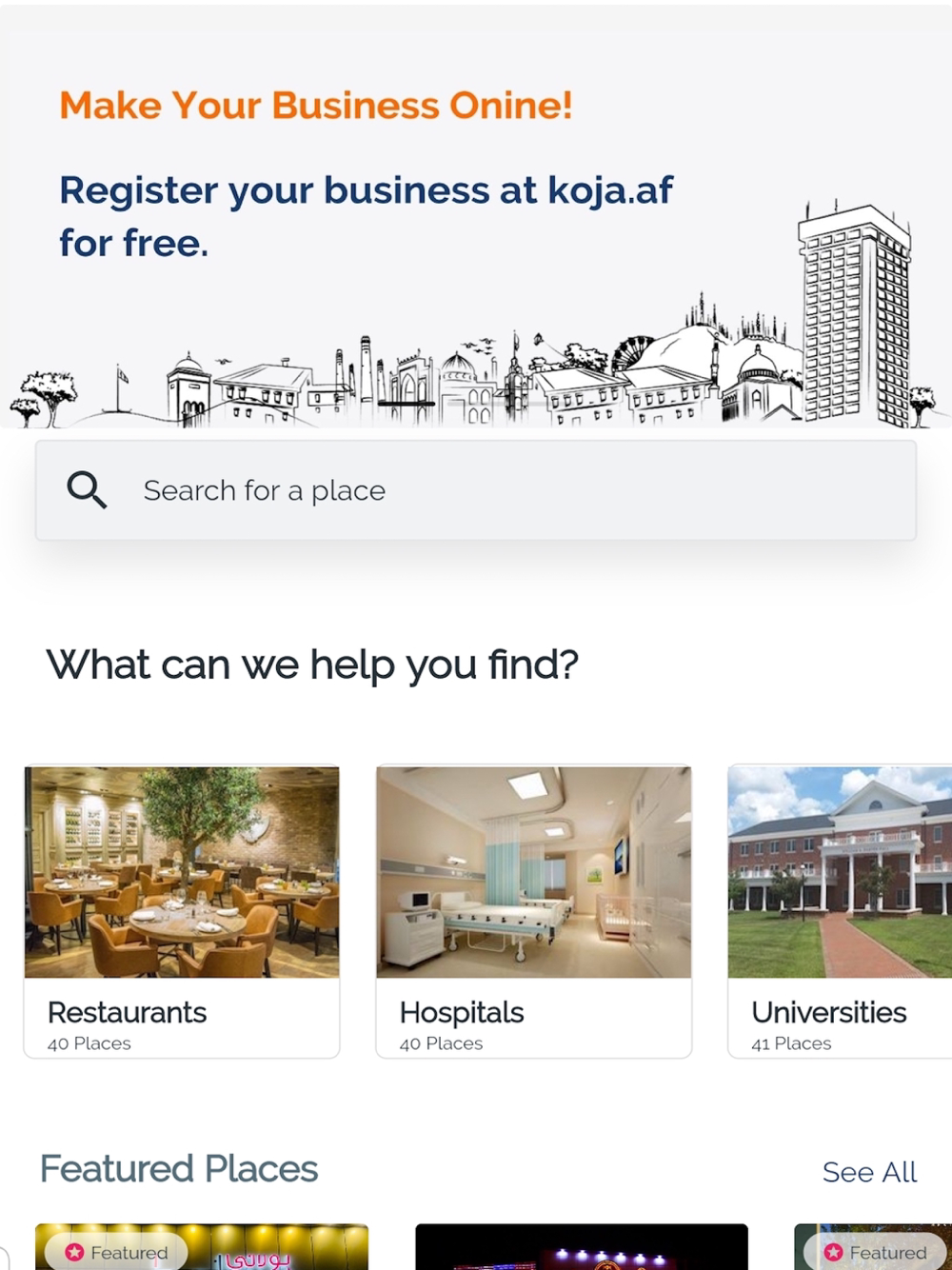 Koja.af helps you find amazing places including businesses, entertainment, parks, hospitals, etc. with its most accurate information.