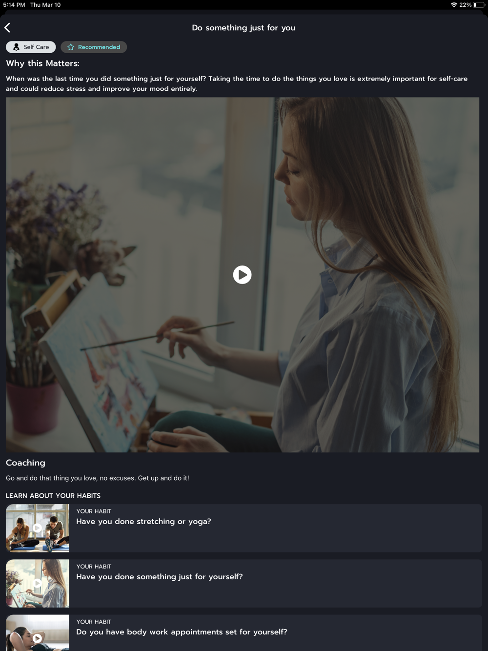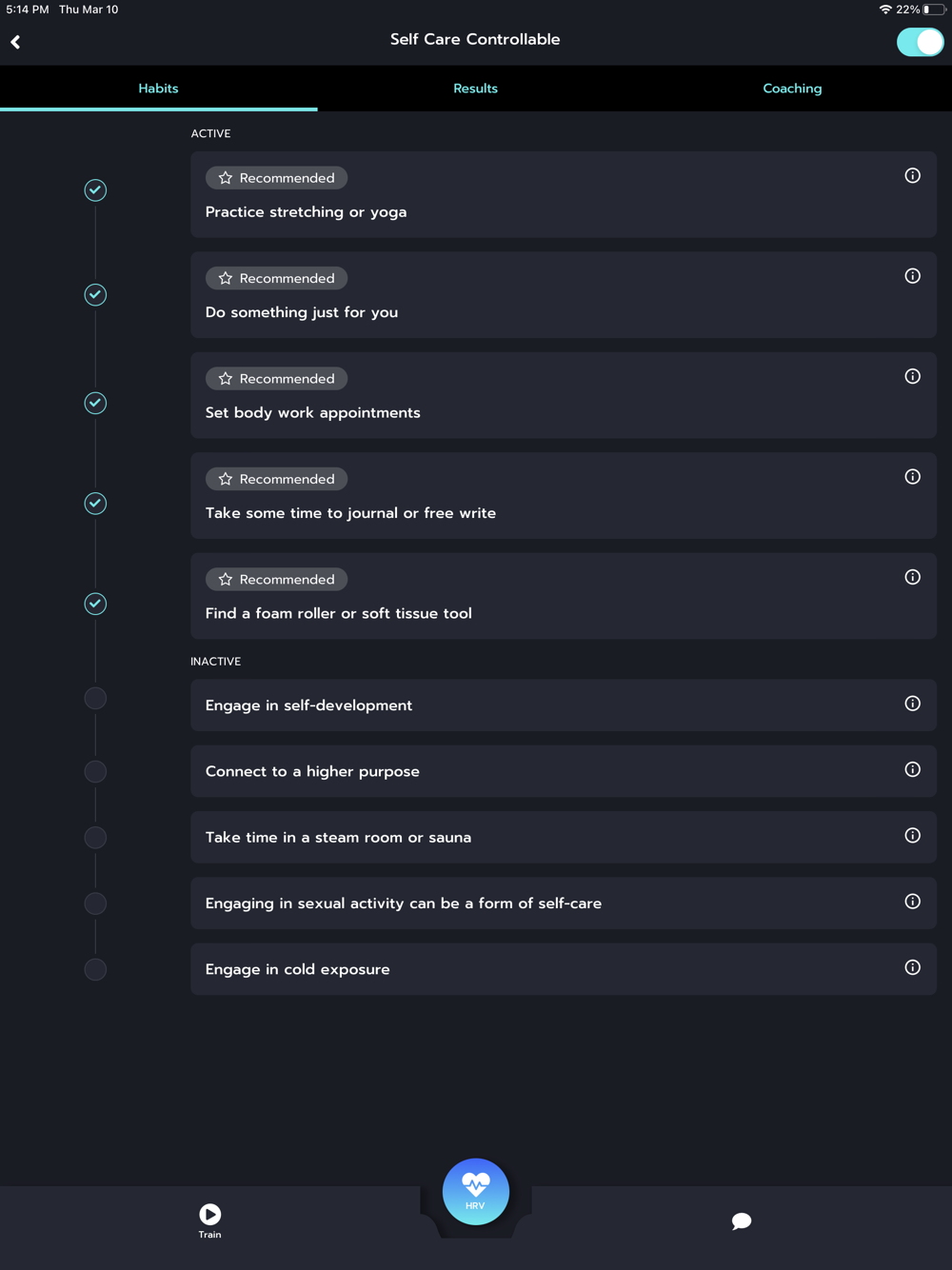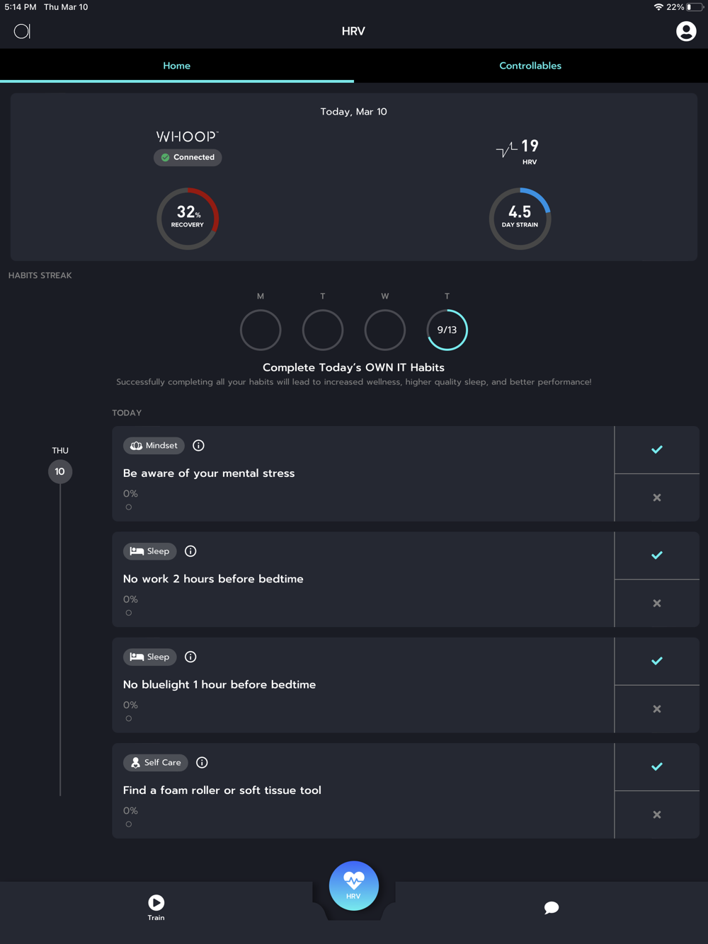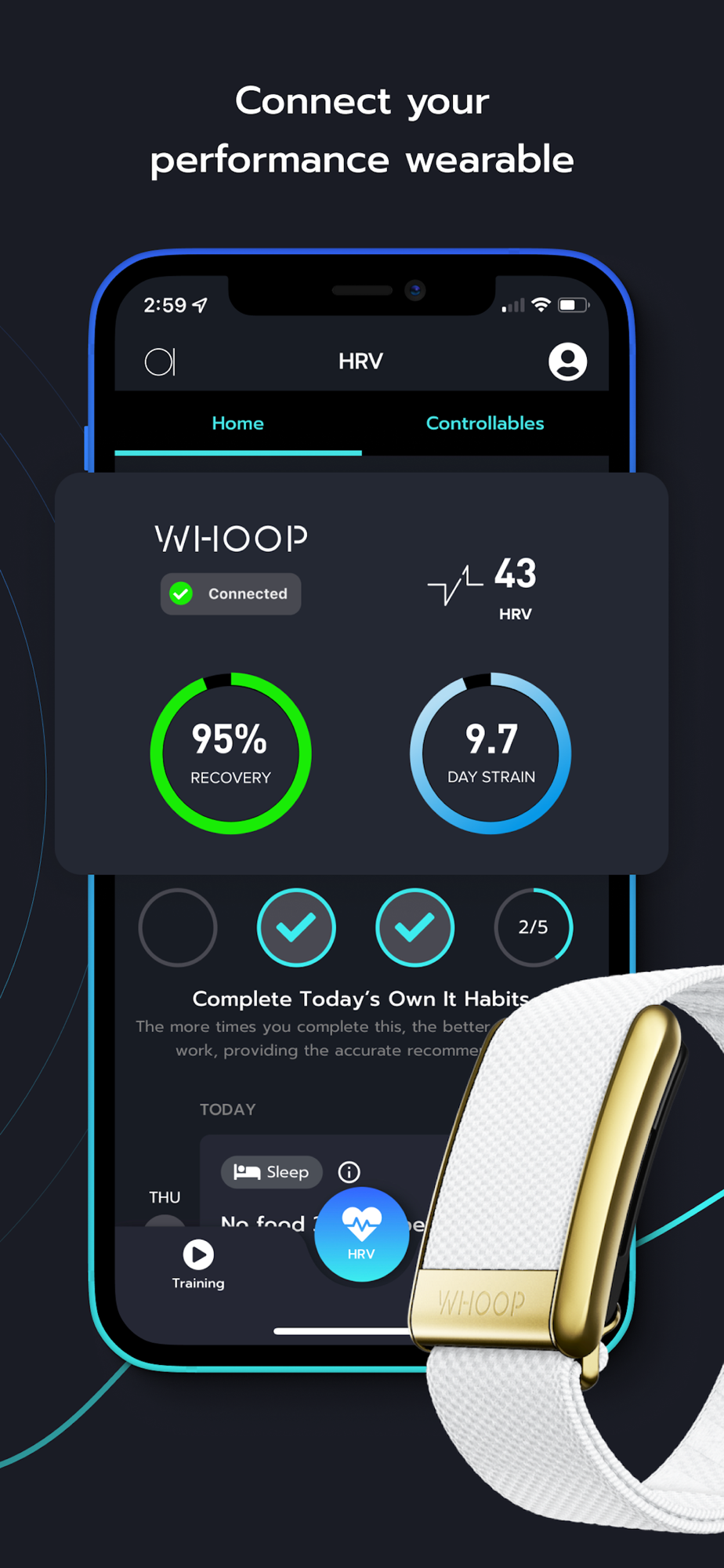 The OWN IT App integrates metrics and data from leading performance wearable technology, such as WHOOP™, so that you can see metrics like strain, recovery, and heart rate variability all within the OWN IT App. See how positive action steps and habit adherence correlate, and graph your wellness improvements or losses so you can track trends over time.