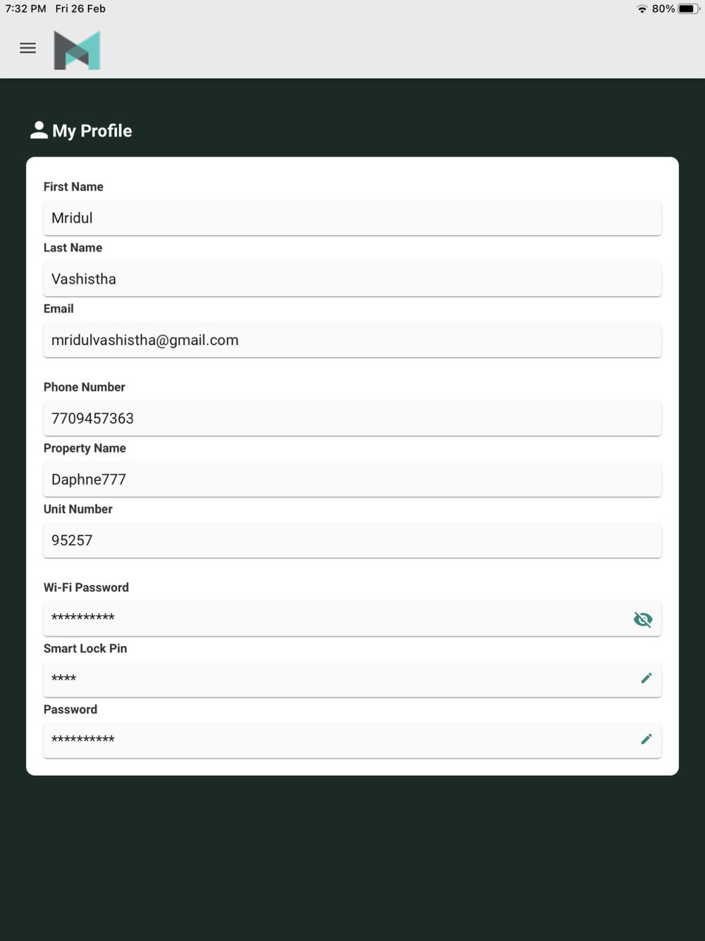 My Profile - Displays your personal information and provides a way to change the SMART Lock's PIN.