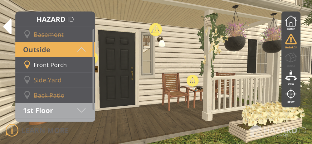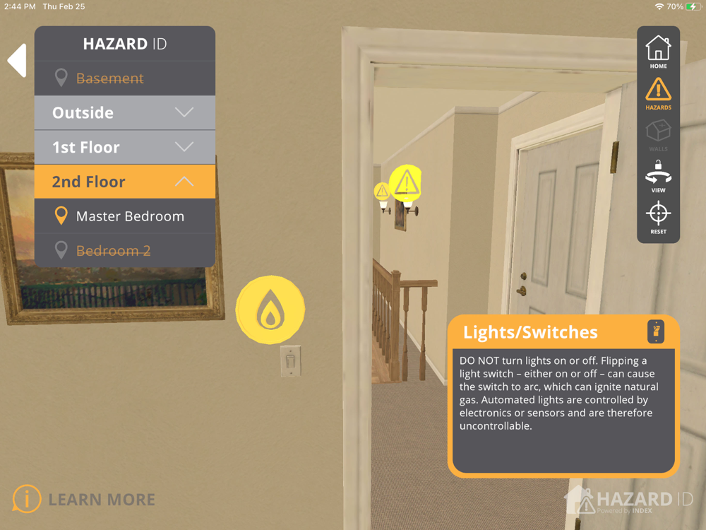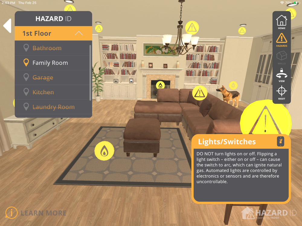 Hazard ID allows users to explore a residential home, through different rooms inside and in the surrounding area, to identify potential natural gas hazards. Hazard ID is a 3D immersive experience that is great for teaching and learning about real-world hazards.