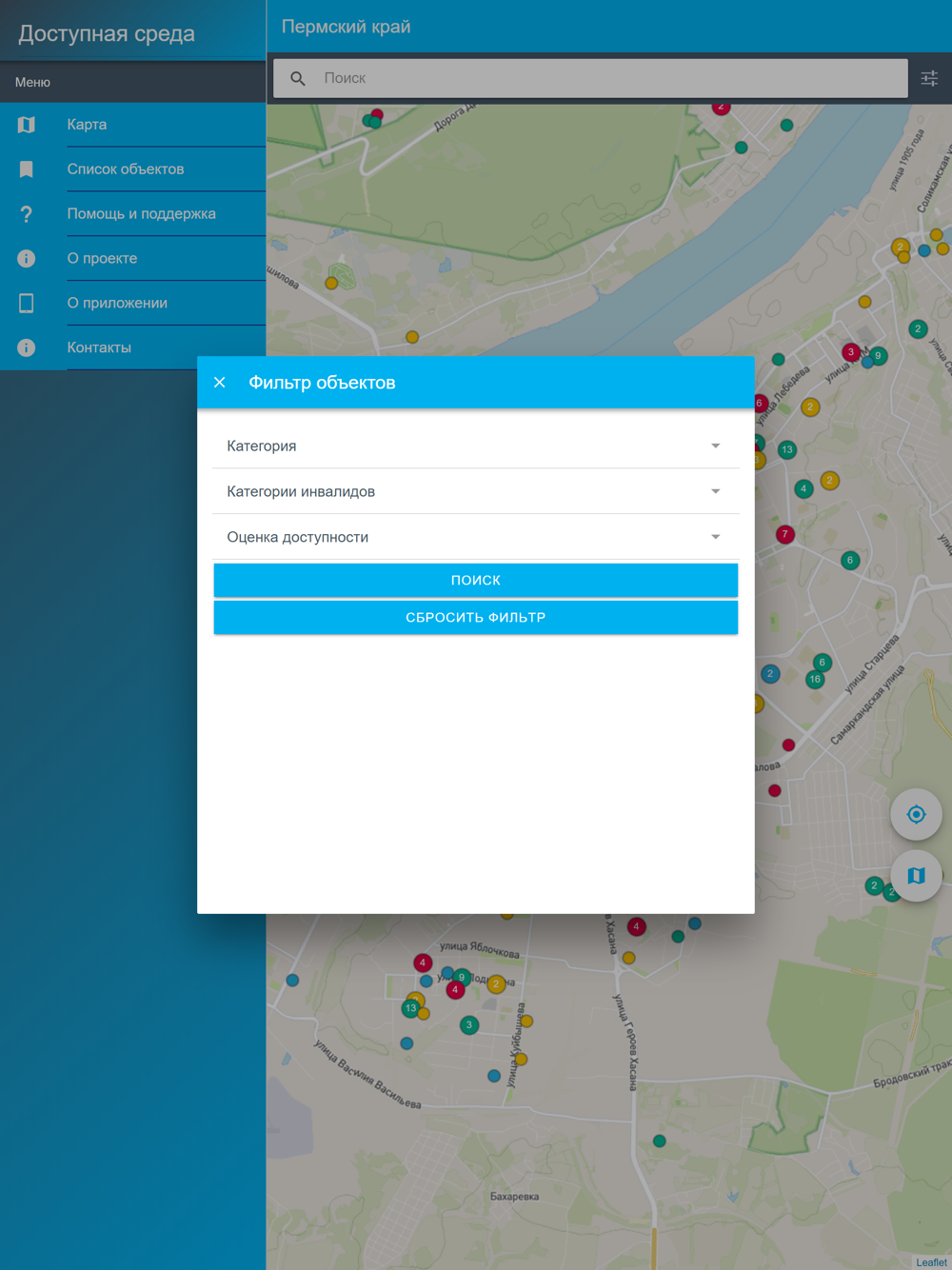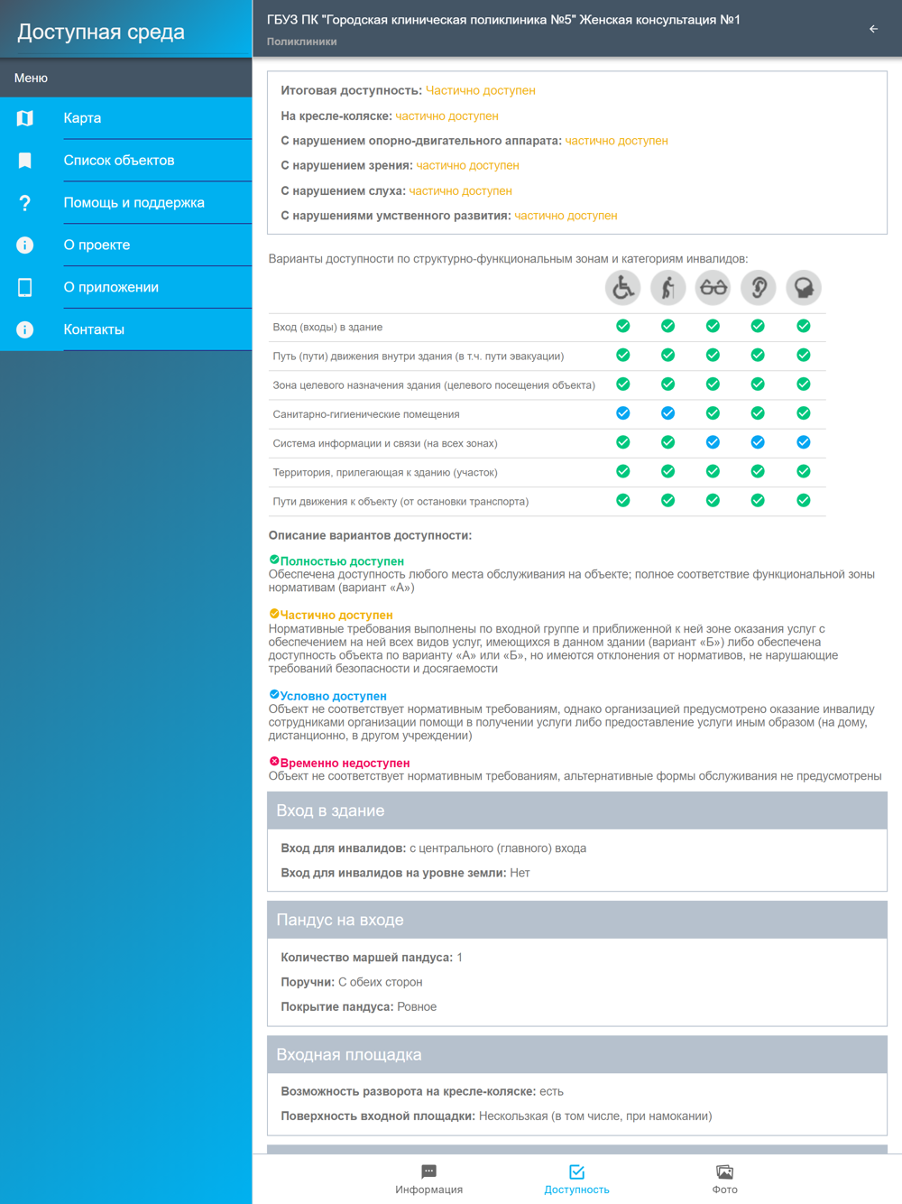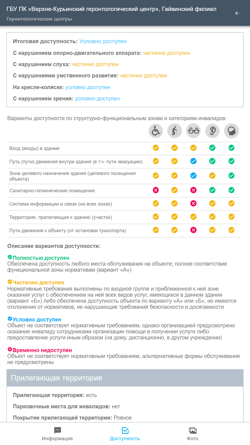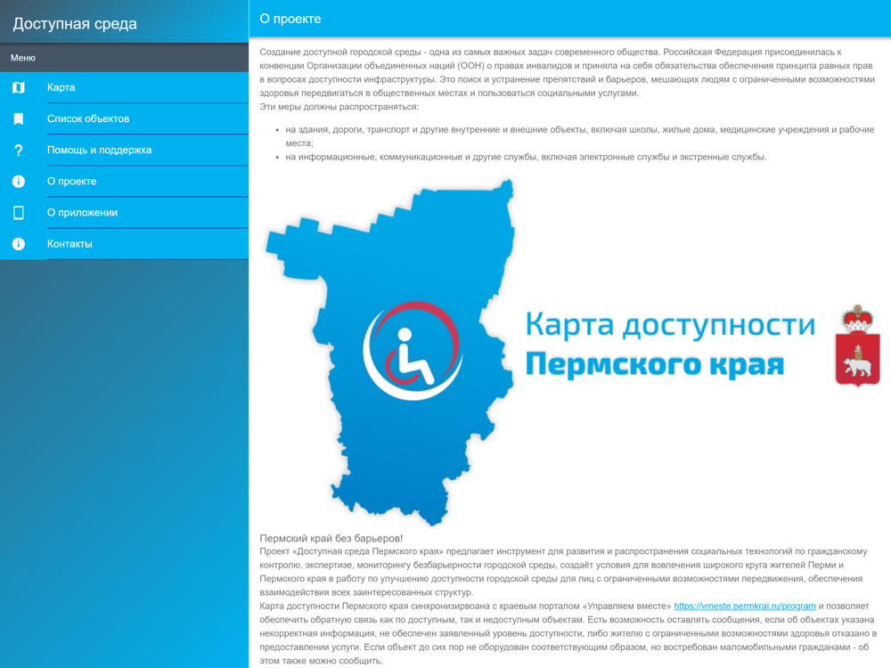 Приложение поддерживает поиск и фильтрацию объектов по названию, адресу, сферам деятельности и типам учреждений, состоянию доступности для отдельных категорий инвалидов. Синхронизировано с порталами «Карта доступности Пермского края» https://bezbarierov.permkrai.ru/ и «Управляем вместе» https://vmeste.permkrai.ru/program.