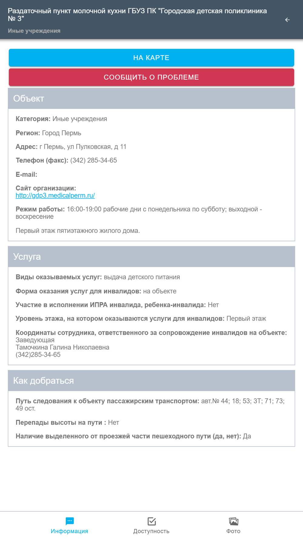 Карта доступности Пермского края содержит информацию о состоянии доступности объектов социальной, транспортной и инженерной инфраструктуры, информации и связи, расположенных на территории региона. Она помогает выявить места, оборудованные для посещения инвалидов и маломобильных групп населения, создает для них безбарьерную среду для более успешной социализации и участия в жизни общества. По каждому объекту на карте содержится информация о его наименовании, месте расположения (адрес), детальном описании доступности для всех категорий людей с ограниченными возможностями здоровья, также можно посмотреть фото.