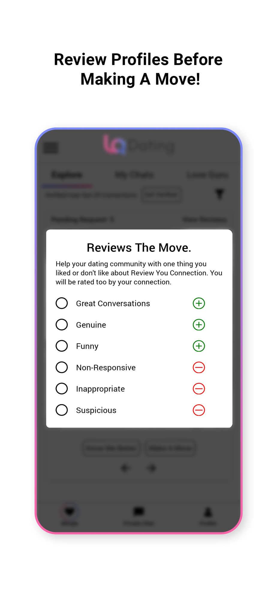 4) Reviews: Check out the other user's reviews about a person before you decide to 'Make A Move' and connect with them.