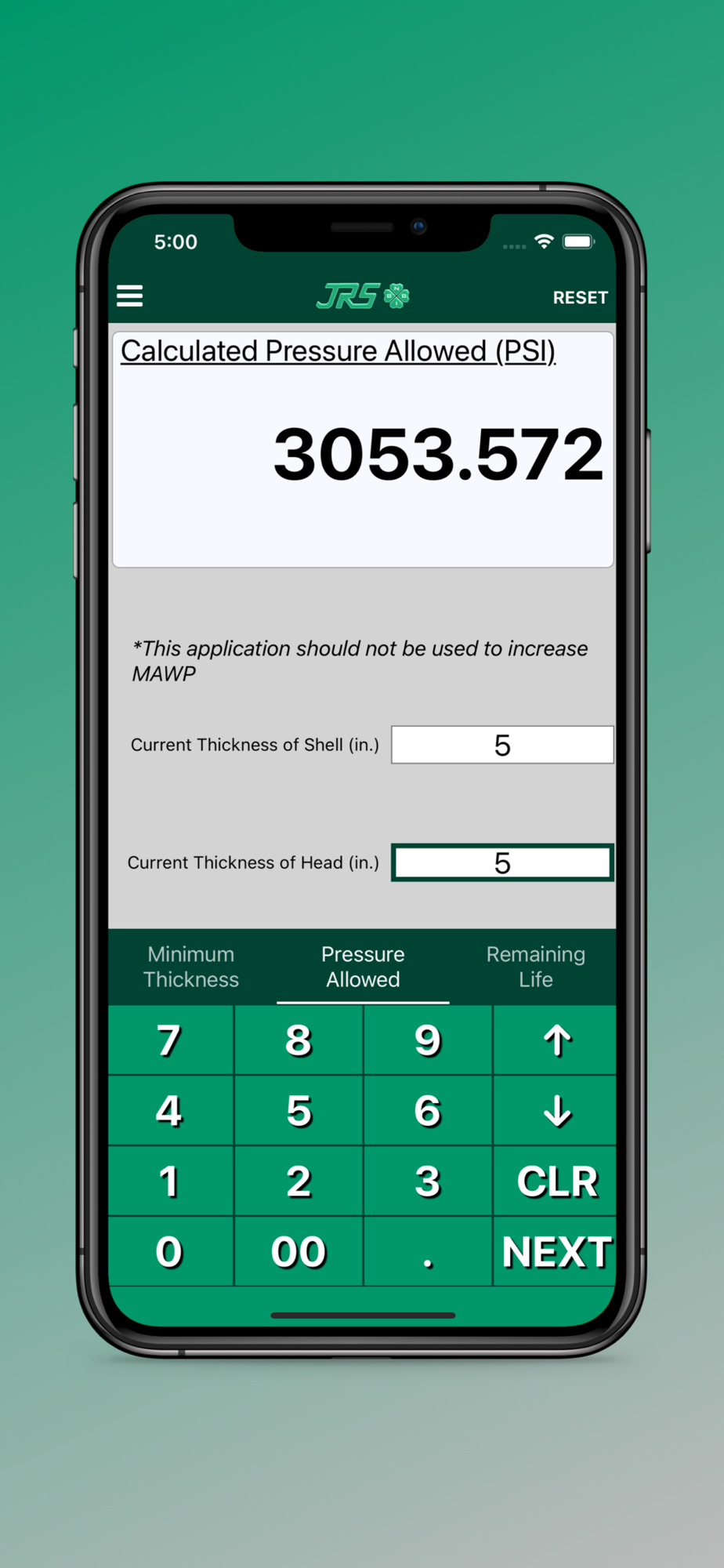 JRS Calculator to calculate the minimum thickness, maximum pressure, and remaining life of a pressure vessel