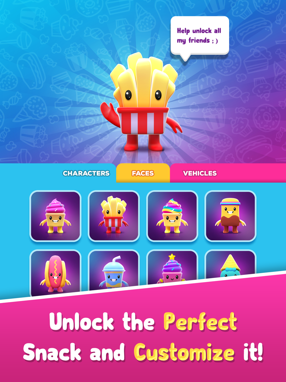 Play as your favorite snack with crazy characters such as; Magic Dein the cupcake, Goub the Ice cream bar, Funky Fries, Slushy, Hotdog, Popcorn and so many more! Not only can you play as your favorite snack but you can customize them as well. Pick out their faces, what their ride is and so much more customization on the way! Each game mode allows you to upgrade your characters. So they can run faster or have more powers.