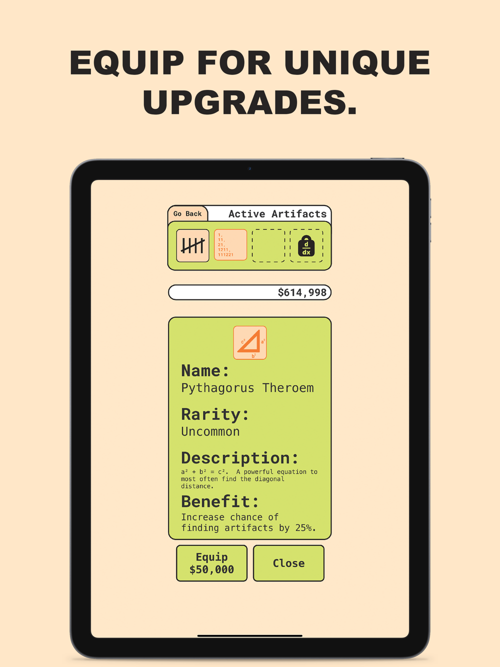 UPGRADES: You have a chance of encountering a "Golden Problem", solve correctly and you'll receive a math artifact that can be equipped to enhance your experience. There are 25 artifacts with 9 unique upgrades that can be used to strategize your problem-solving career!