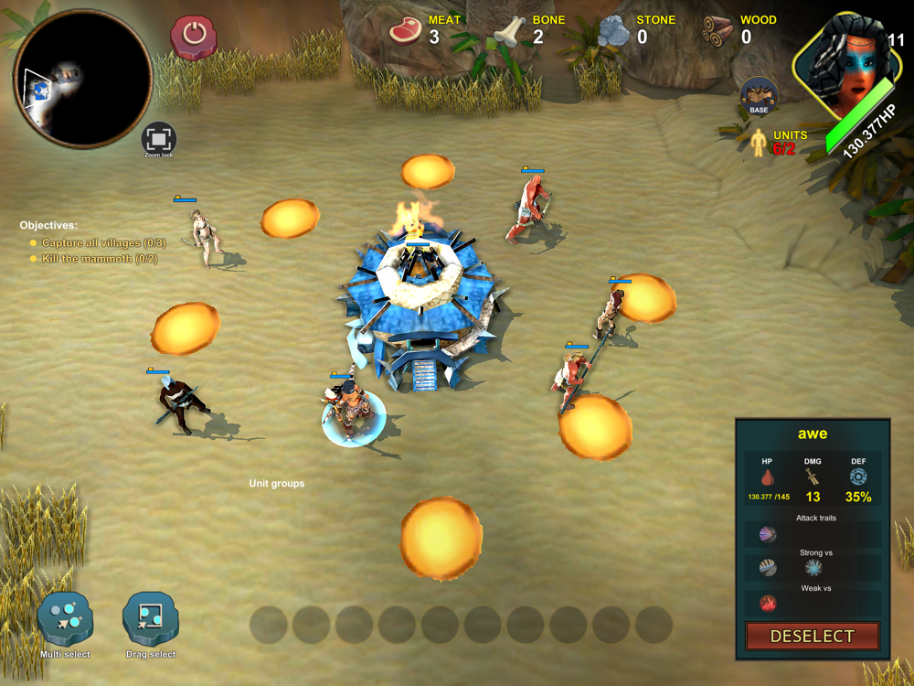 You begin the game by selecting a male or female hero warrior who can level up over time as you play. Use your hero to complete objectives and earn tech points spendable at the tech tree screen to improve you tribes buildings, weapons and stats.