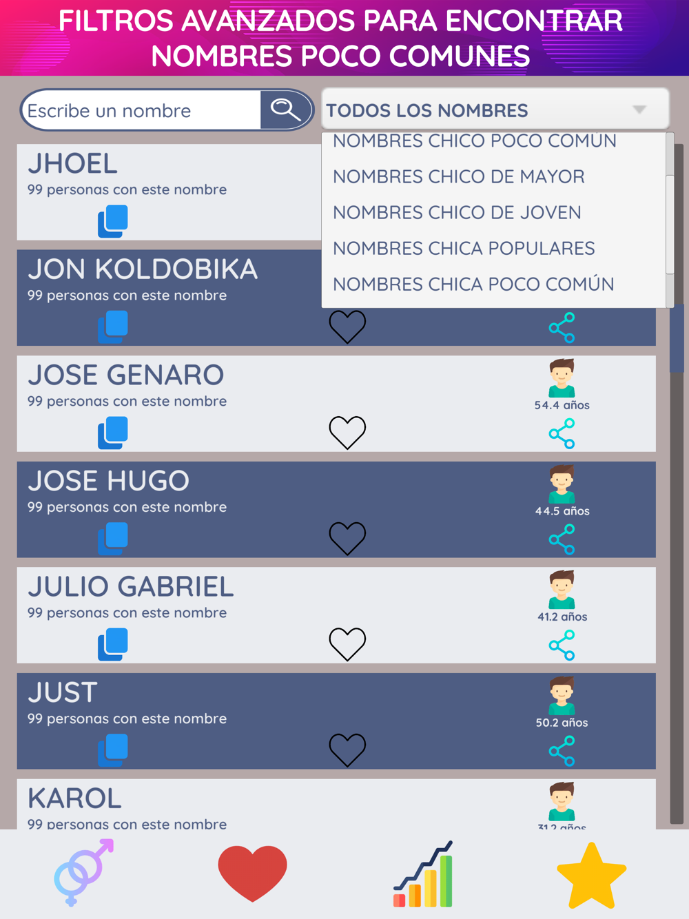 - Lista de favoritos para que guardes los nombres que más te gustan.