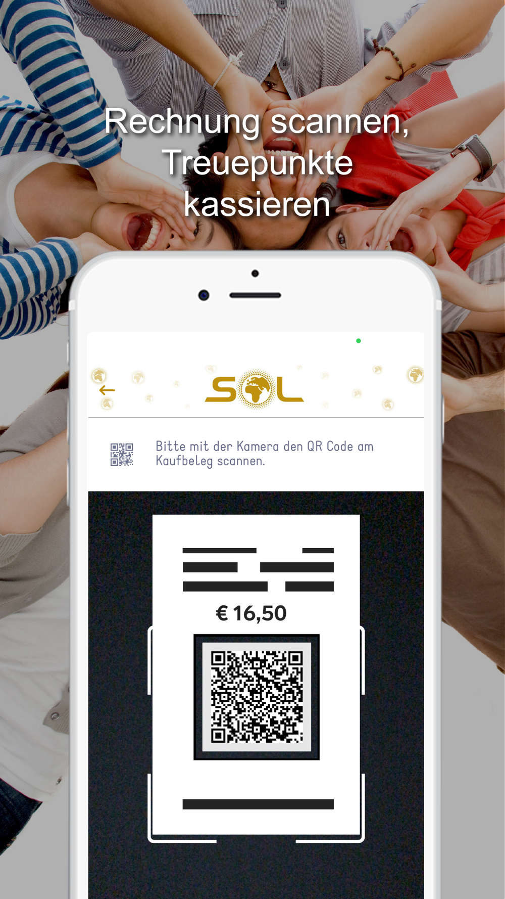 Scanne mit der App bei jedem lokalen Einkauf deinen Kassenbon und sammle so den SOL Treuebonus. Du bekommst mit dem SOL einerseits wertvolle Prämien für dich und deine Familie und andererseits kannst du mit dem SOL auch sozial, ökologisch und lokal wertvolle Unternehmen, Projekte und Trends fördern. Also du wirst gefördert mit SOL und du förderst mit SOL - und das ganz easy mit einer App!