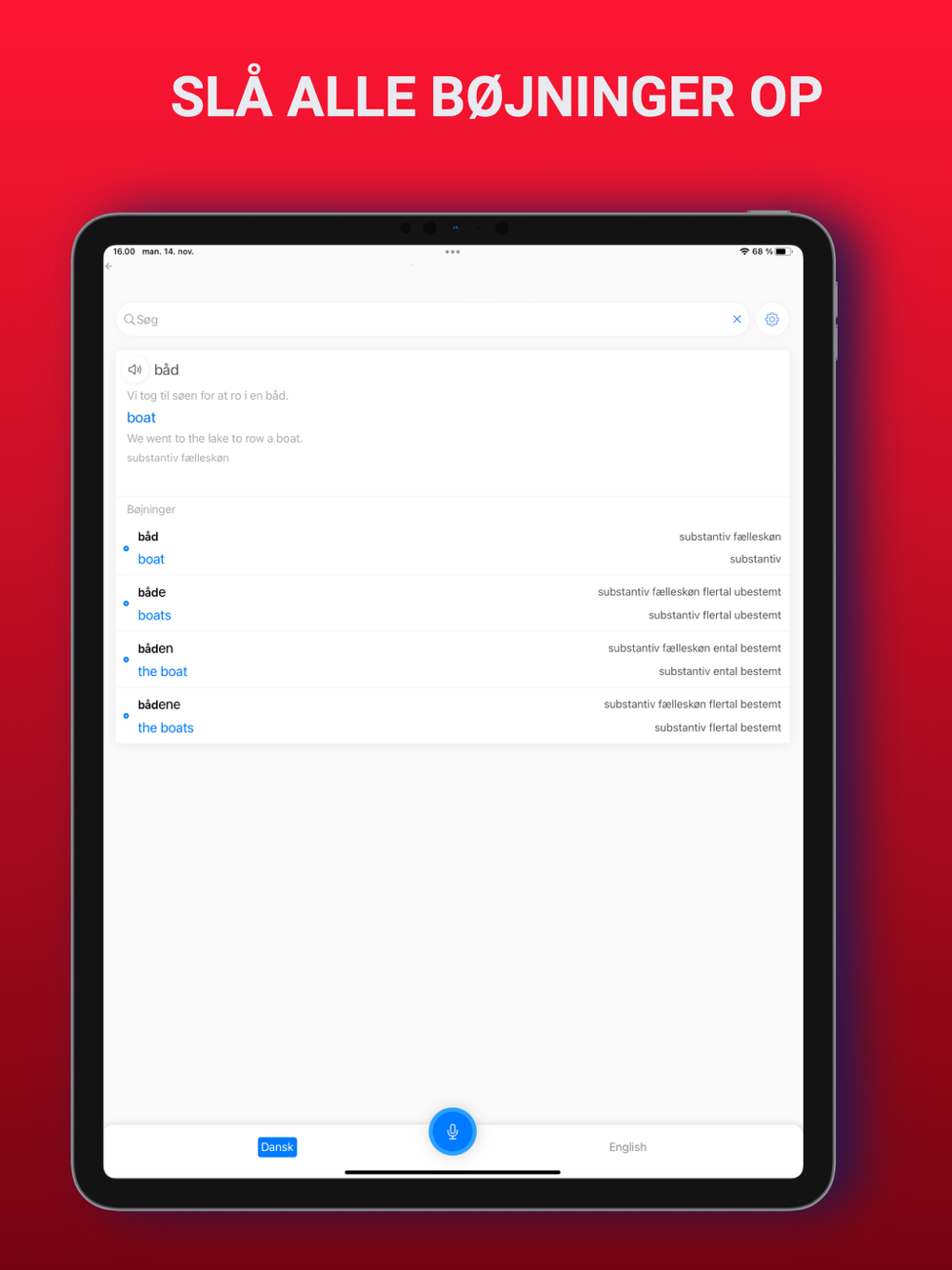 Du kan slå bøjede former direkte op uden at kende grundformen på et ord.