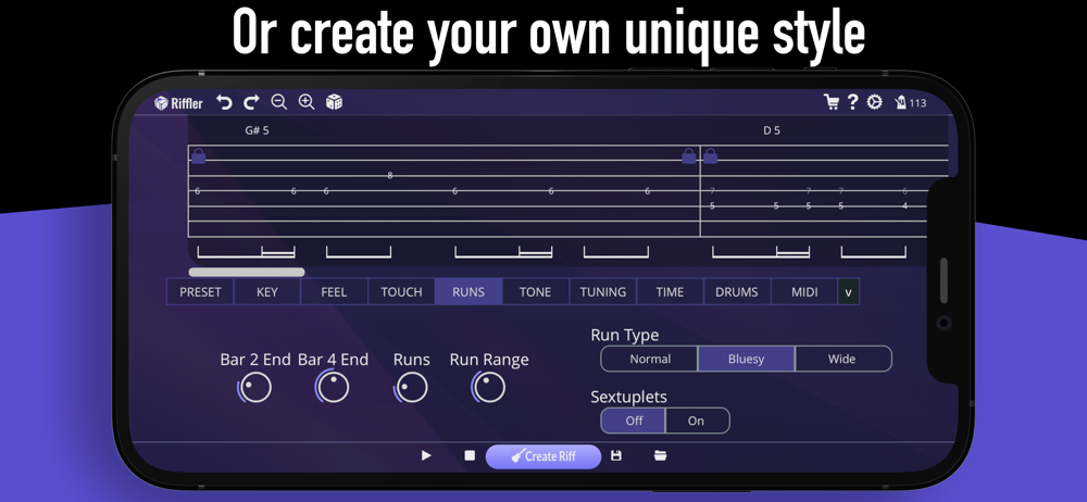 Instantly create unlimited, copyright-free guitar riffs. Just tap "Create" and listen to your new riff.