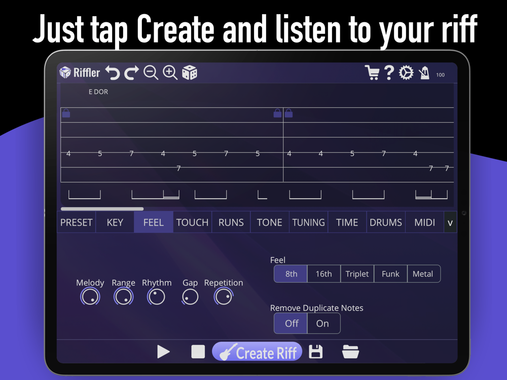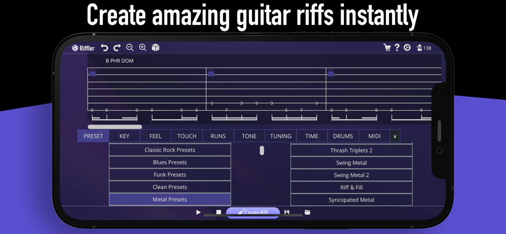 The easiest way to get started is to select from the huge list of preset musical styles, tap "Create", and a unique guitar riff will be made. The created riff is displayed as guitar tablature which you can listen to and save.