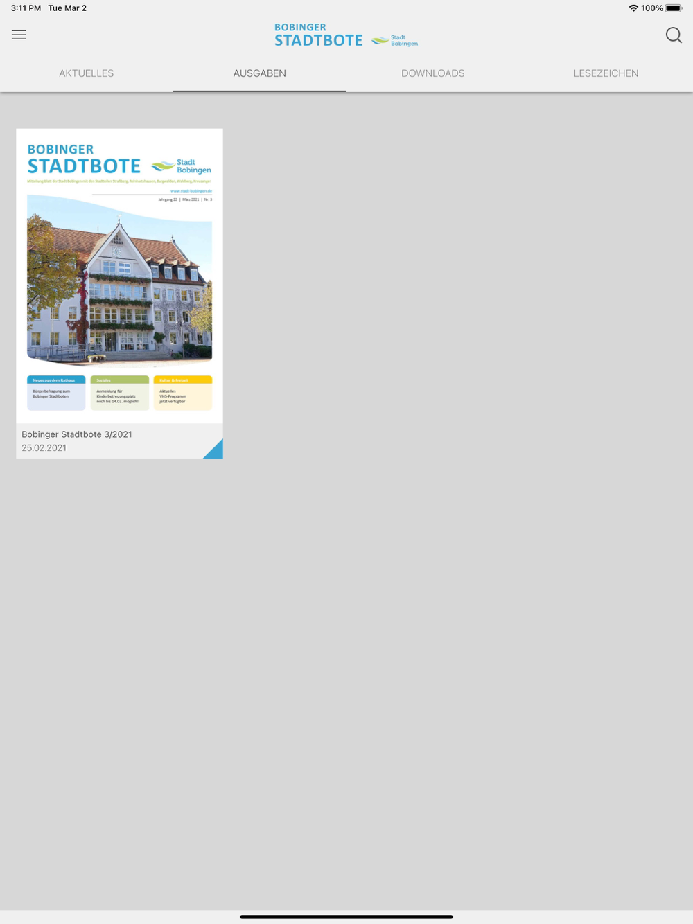 "Eine eigene App für den „Bobinger Stadtbote“. Mit der App „Bobinger Stadtbote“ können Sie aktuelle und vergangene Ausgaben als ePaper lesen. Sie können auf den einzelnen Seiten hinein und hinaus zoomen. Einmal heruntergeladen, stehen Ihnen die einzelnen Ausgaben auch ohne Internetverbindung zur Verfügung.