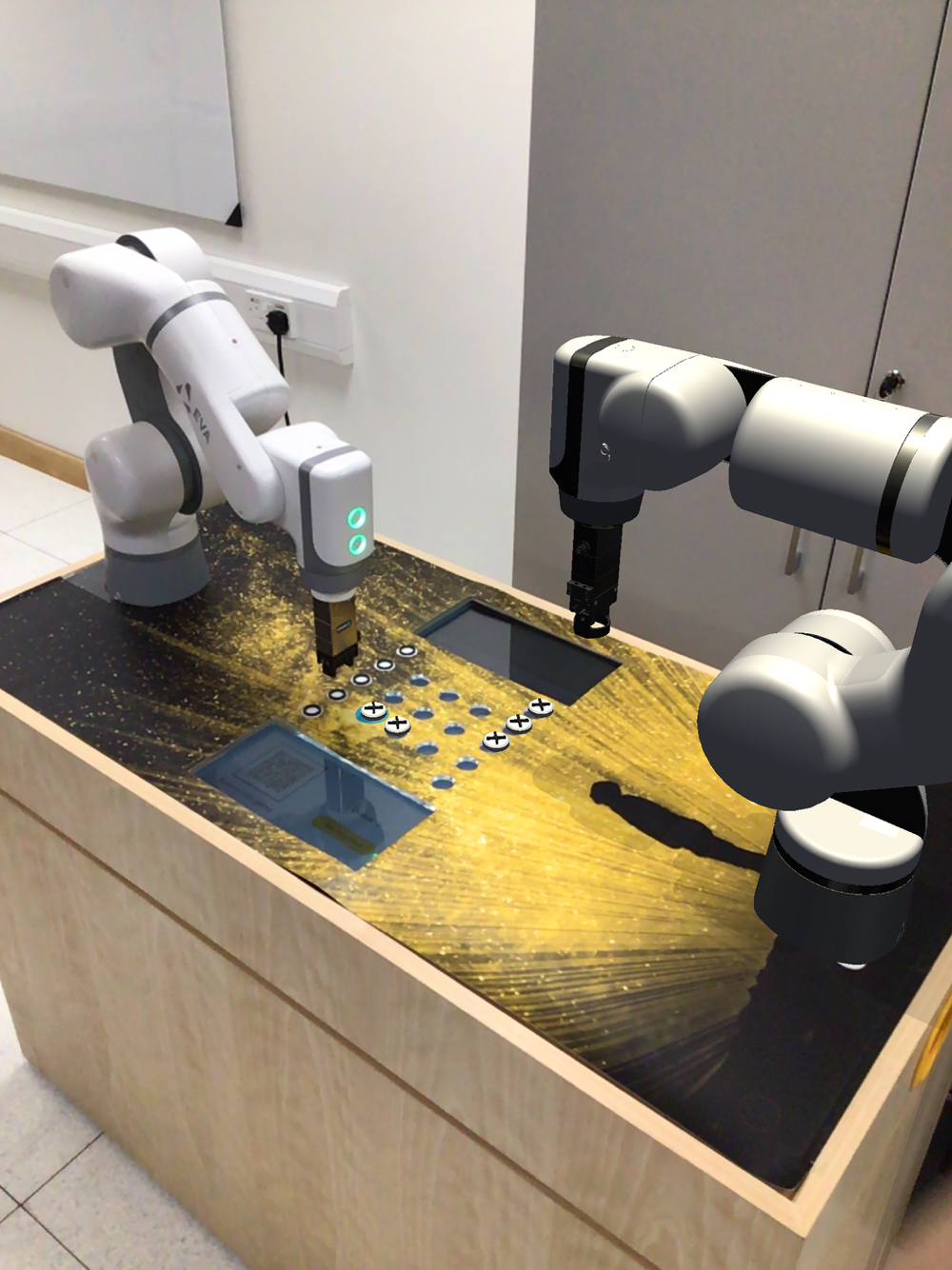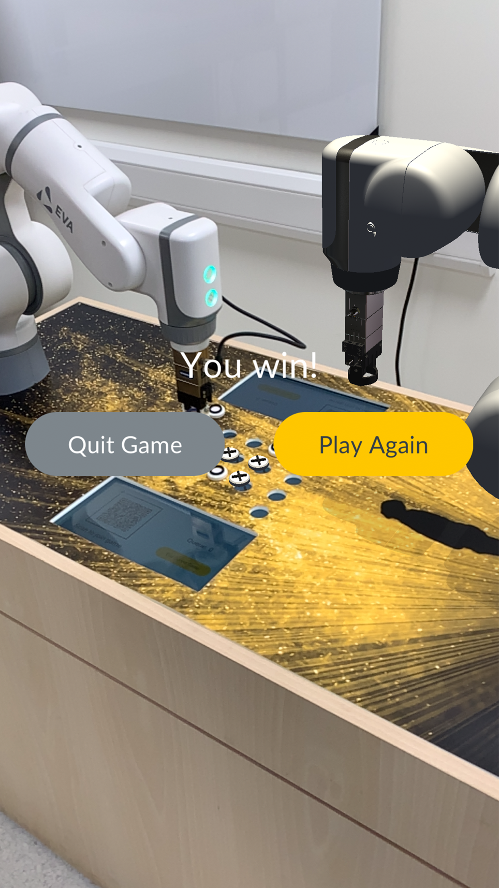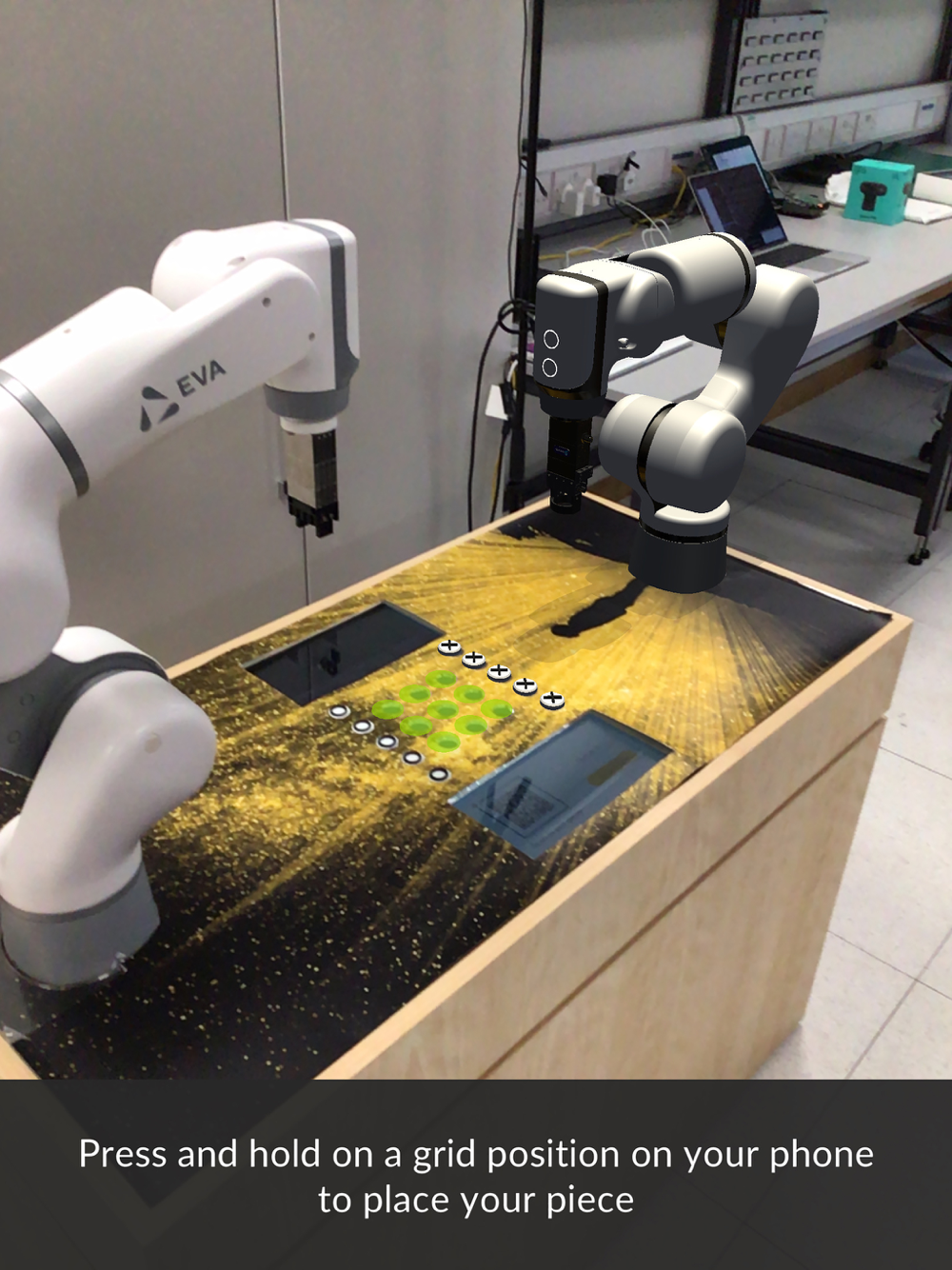 Scan the QR code on the plinth and use your device play your moves in AR against the physical robot arm in a game of Tic-Tac-Toe.