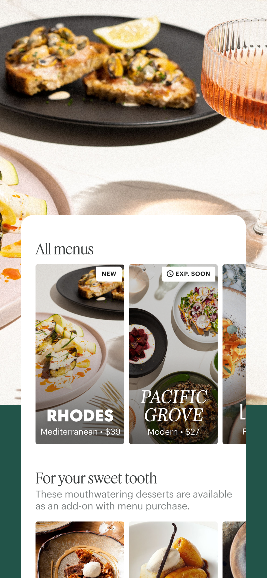 Access the taste, texture and temperature of your favorite restaurants through Entrée’s finish at-home dining experiences. Each multi-course menu is exclusive, curated and simple to execute. Enjoy incredible flavors from dishes including black truffle croquettes, ribeye steak in black mole sauce, seven-mushroom risotto or salmon en papillote.