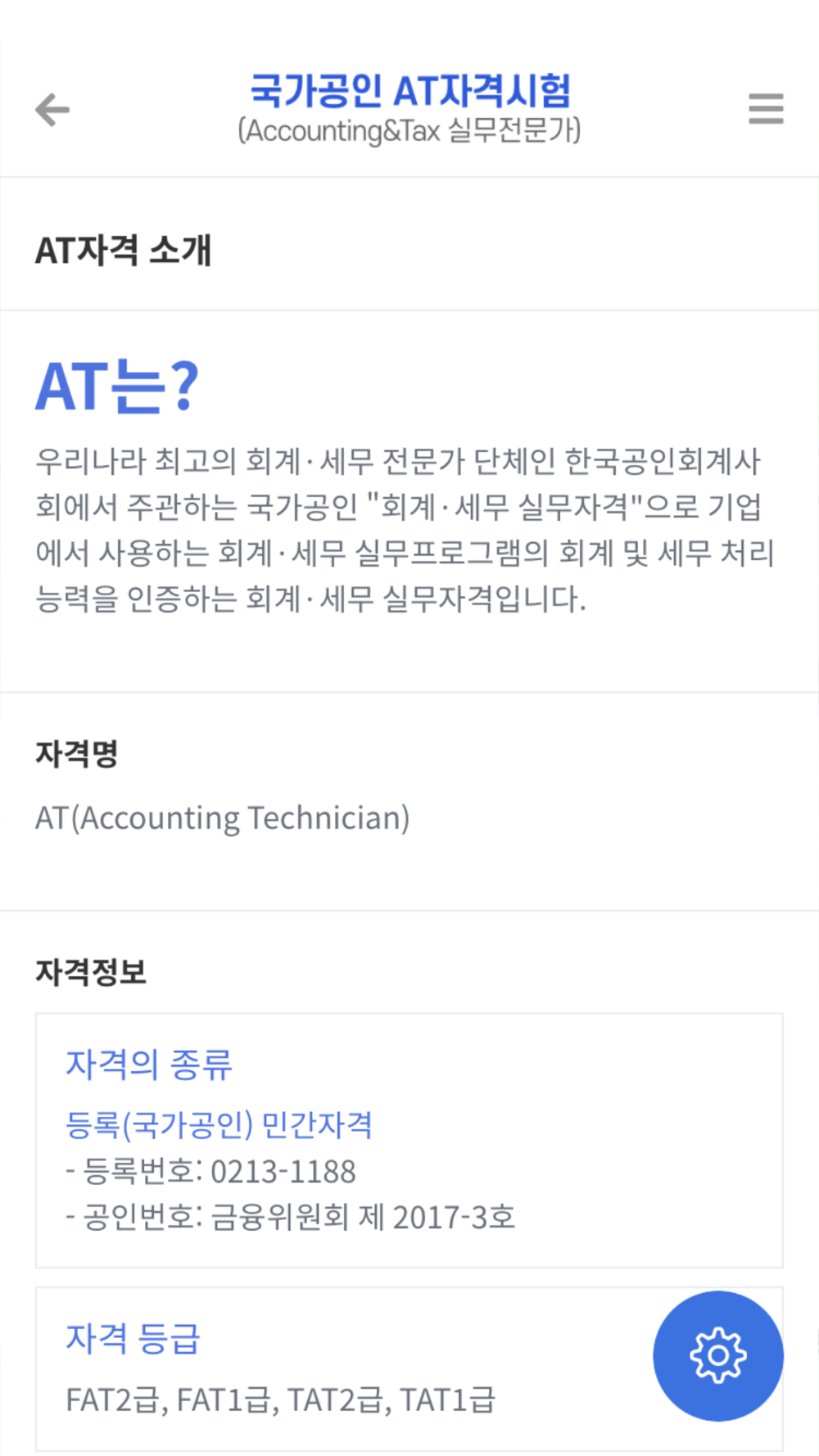 AT(Accounting &Tax 실무전문가)는 한국공인회계사회가 더존 SmartA 프로그램을 기반으로 실시하는 국가공인 회계세무실무 자격시험입니다.