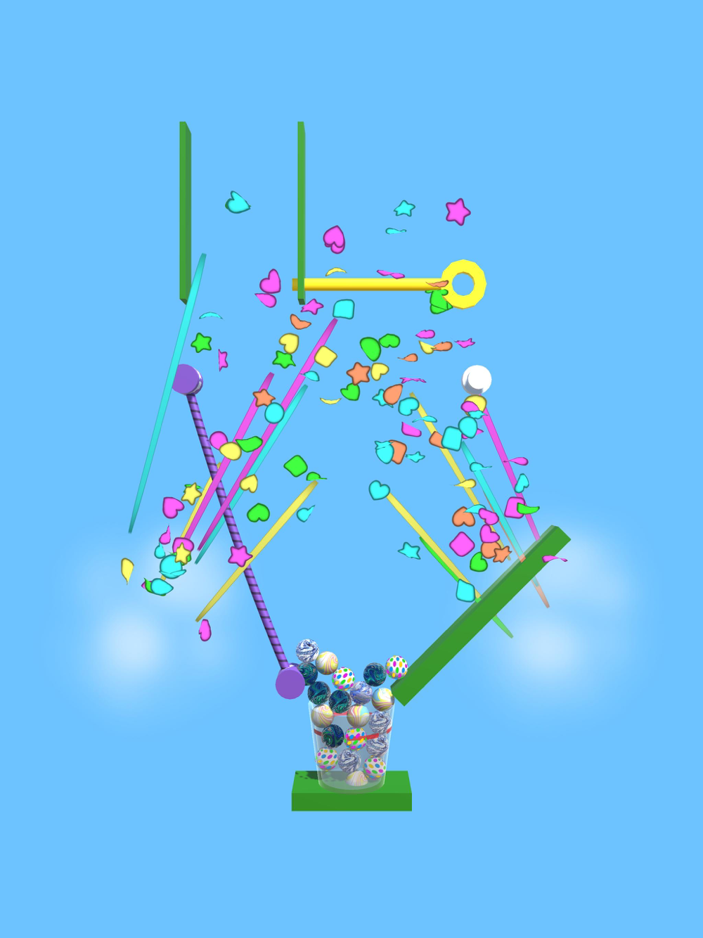 Manipulate the rope to make a path for the marbles to roll down, then put them in the cup!