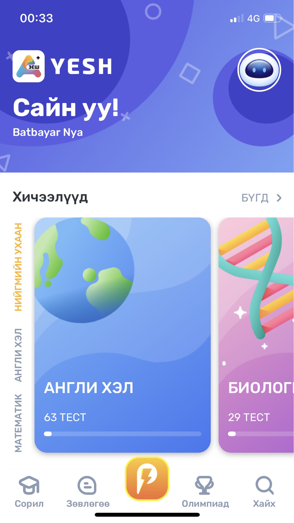 Бид Gamification технологи ашиглан ЭЕШ-д бэлдэх аргачлалыг маш хялбар болгож байна. Та Yesh.mn Апп-с ЭЕШ-тэй холбоотой мэдээллийг маш эмх цэгцтэй авах боломжтой. Мөн ирээдүйн мэргэжлээ сонгоход бид таньд туслая.