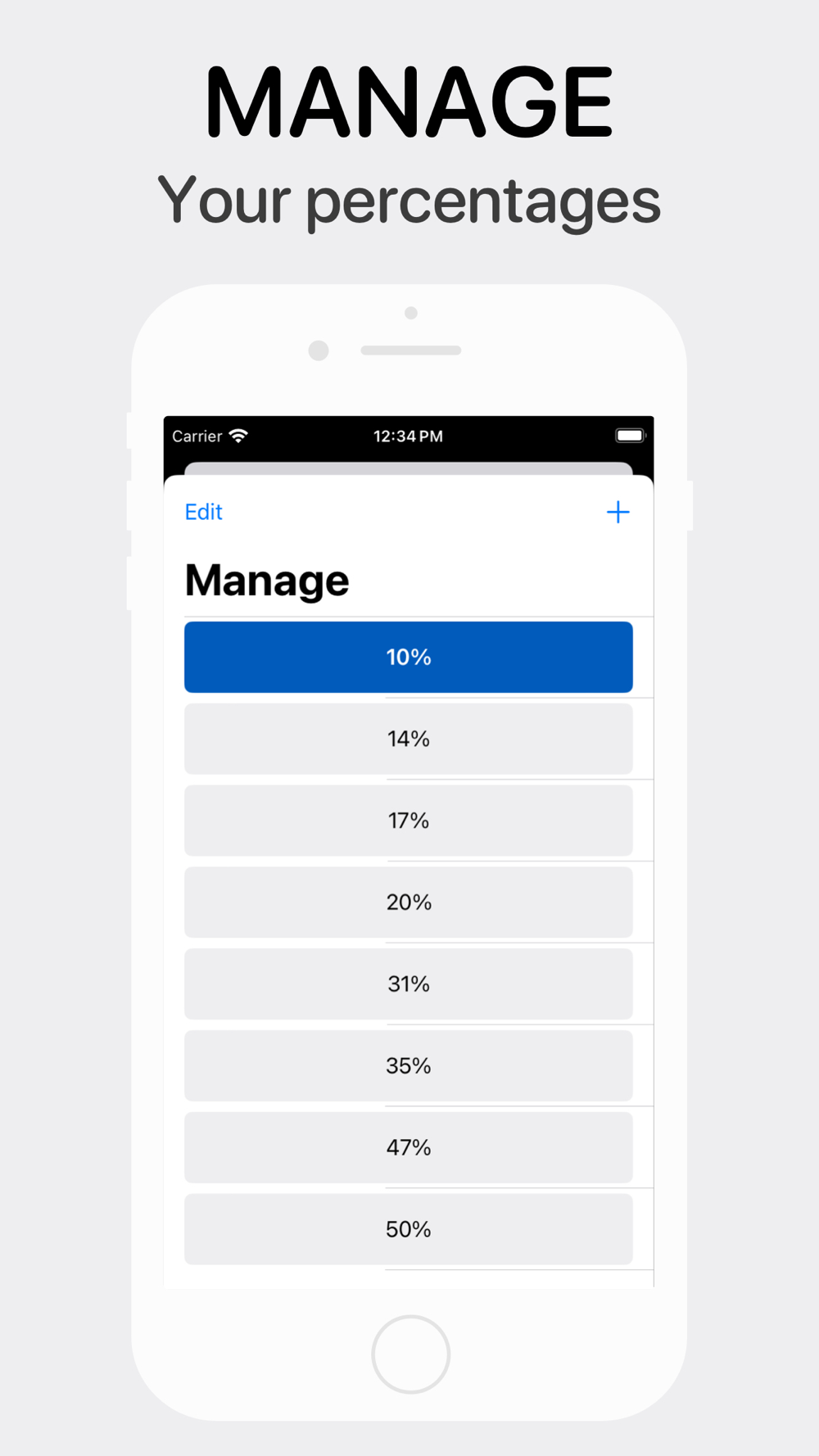Customizable Percentages: Easily save commonly used percentages or add your own for quick access.