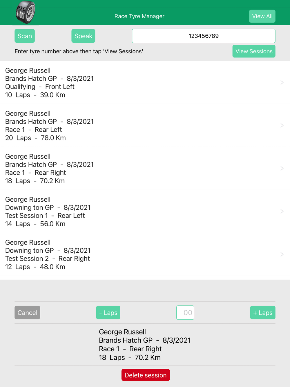 Enter the details of each race or test session and Race Tyre Manager will log the details and calculate the km distance of each session and total of all sessions for each tyre.