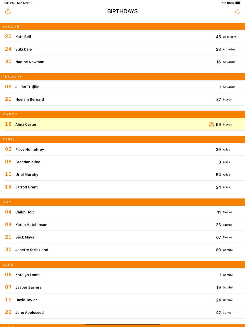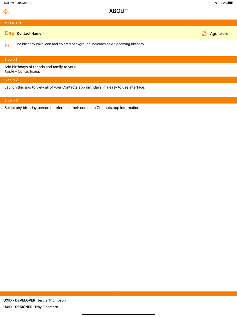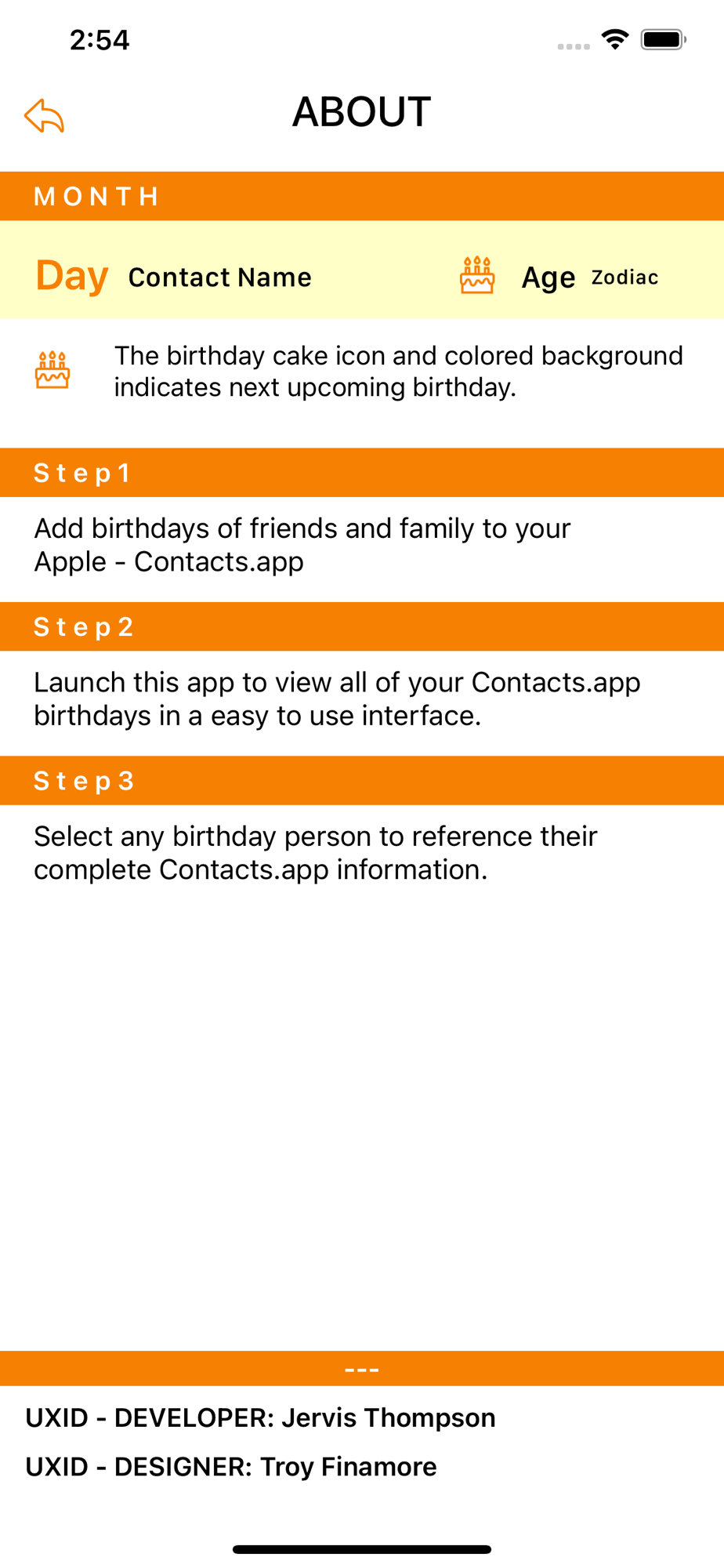 Introducing the ultimate birthday companion for your iPhone. Never miss a friend or family member's special day again! With this app, you can easily view all the birthdays stored in your Contacts app sorted by birthdate. The app highlights the next upcoming birthday making it easier for you to plan ahead. It also deep links to your contacts app. Plus, it even displays people’s age and zodiac sign, making it a fun and interactive way to stay organized. Download Birthdays today and make sure you never forget a birthday ever again!