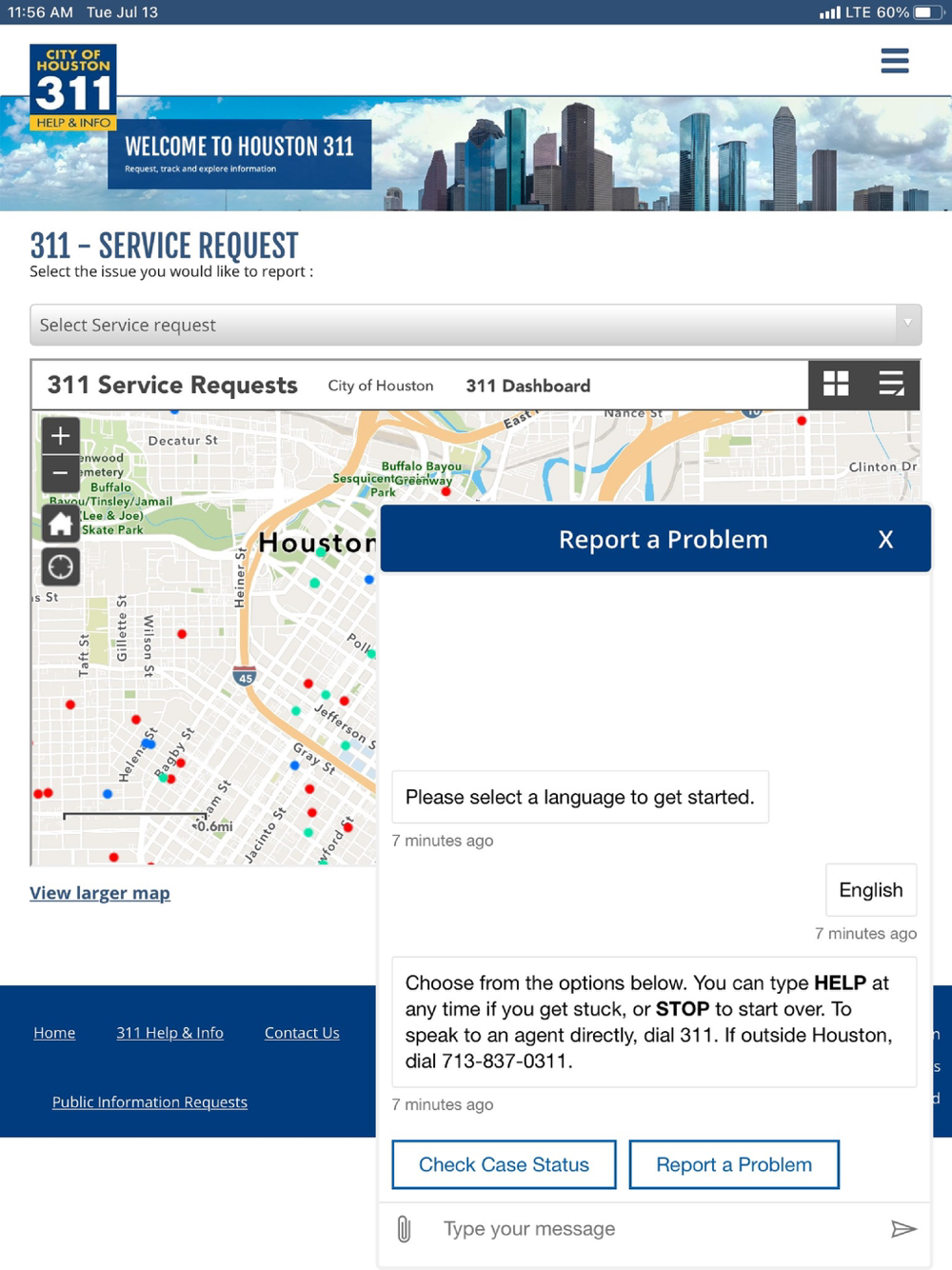 The 311 Houston Help and Information Helpline puts City government at your fingertips – one contact, via the channel of your choice -- and you get answers, find the right person, or have your City service problem solved.