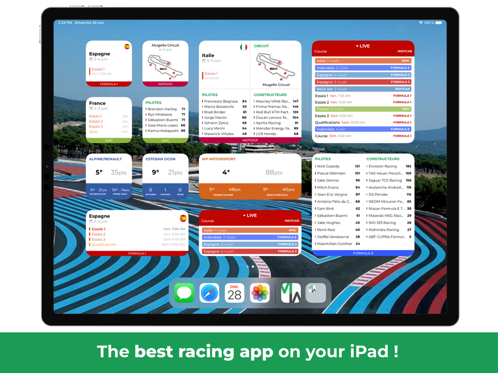 Several categories available : Formula 1, Formula2, Formula3, FormulaE, IndyCar, MotoGP, Moto2, Moto3, WSBK, WEC, ELMS, WRC and ERC (and more are coming !)
