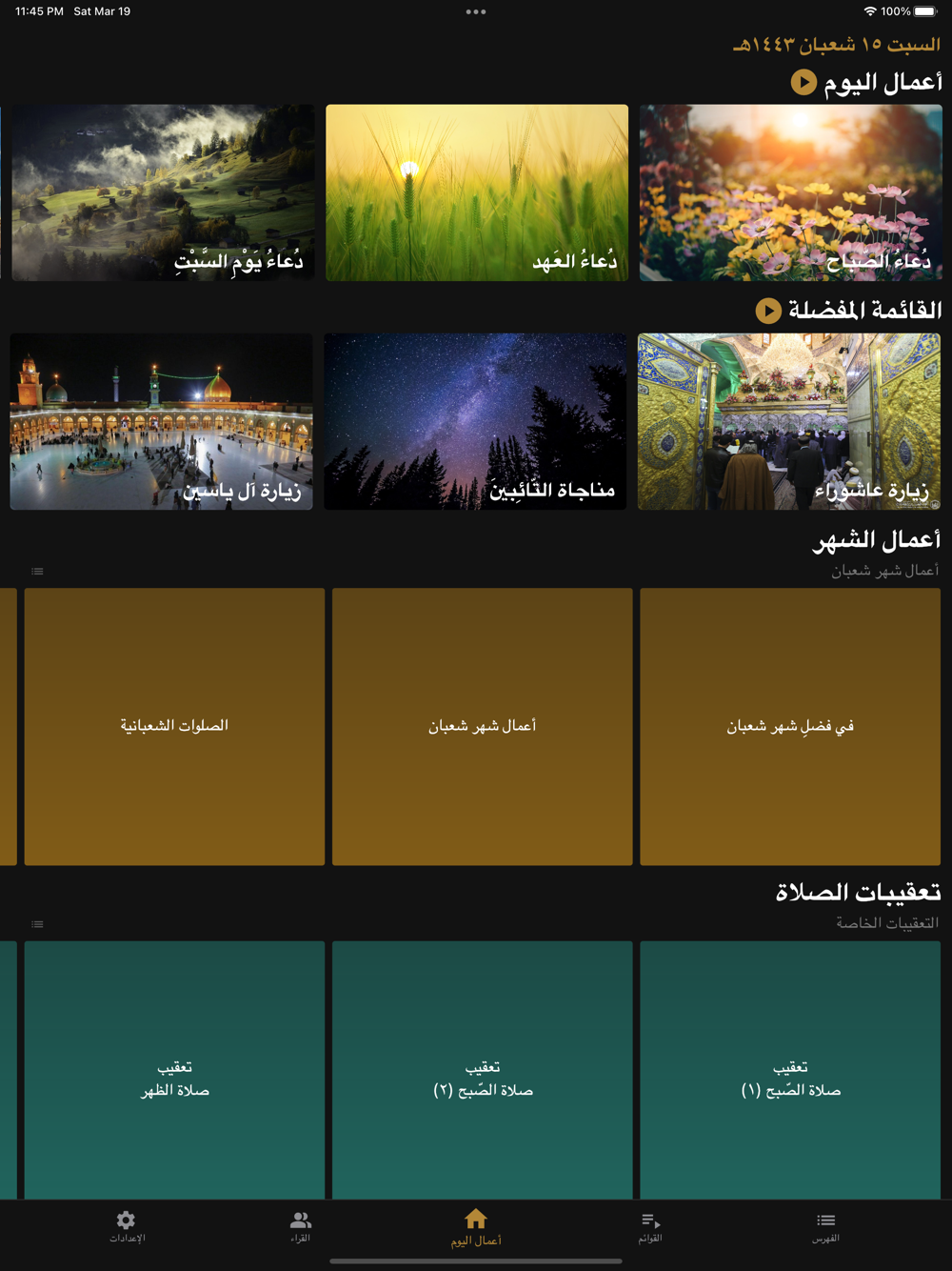 * قائمة بالأعمال اليومية (دعاء الصباح، دعاء اليوم، زيارة اليوم،…) في الشاشة الرئيسية.