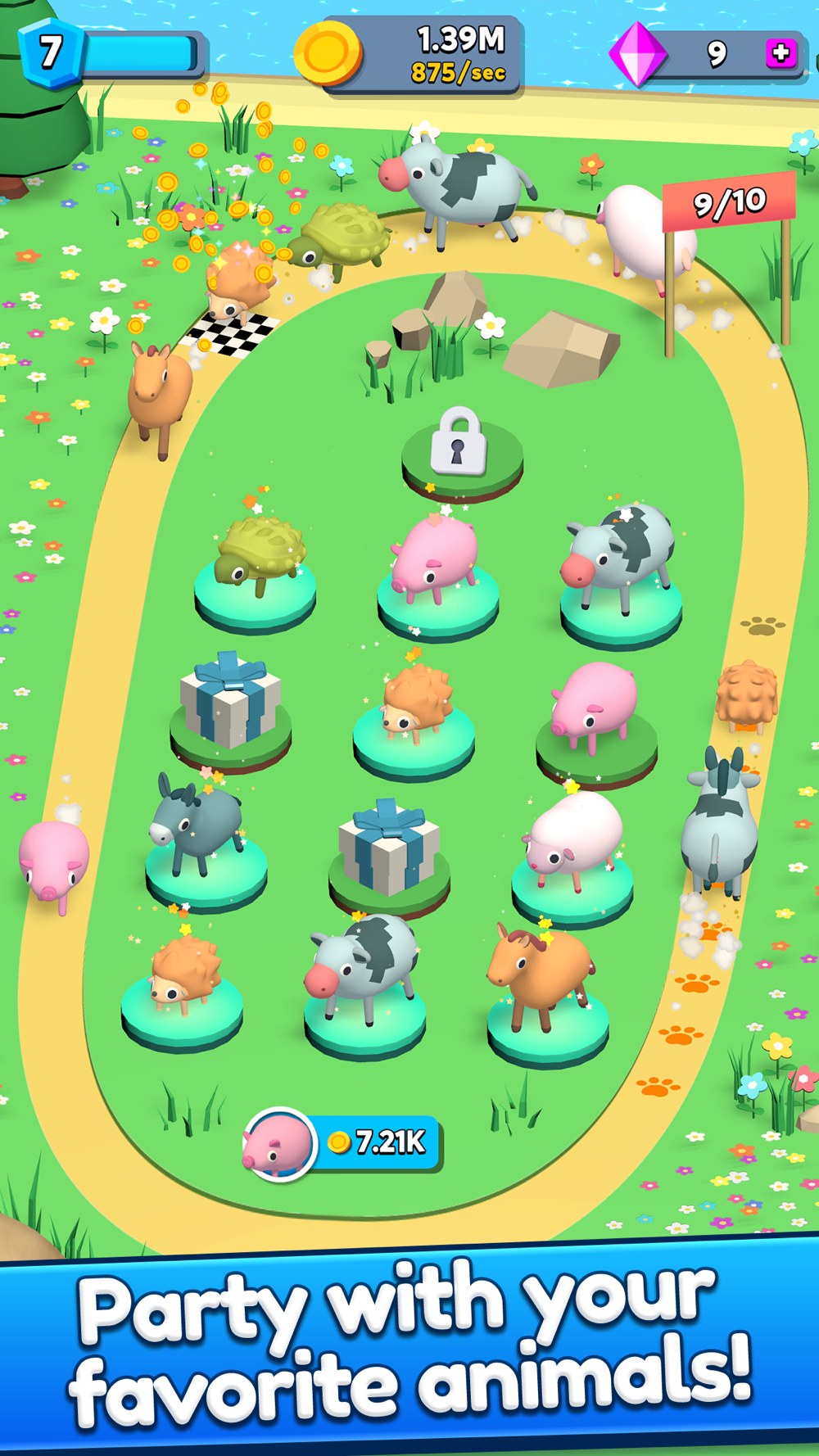 -	Over 40 adorable animals run, jump, prance, and merge in an endless party that continues even while you’re idle or away!