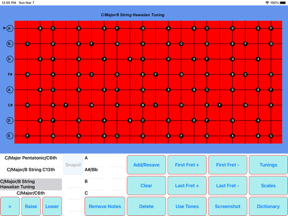 The app comes pre-loaded with many tunings and scales but users are free to add their own. When a tuning and a scale are combined with a root note a Dictionary Item is created. These items can be displayed on the app's fretboard in an infinite number of ways and saved as snapshots. Users can block off certain frets if they want to drill down on scales or chords on different parts of the fretboard. One big drawback of alternate tunings is that you would have to relearn all the chords and scales you've already invested so much time figuring out. That problem is now solved.