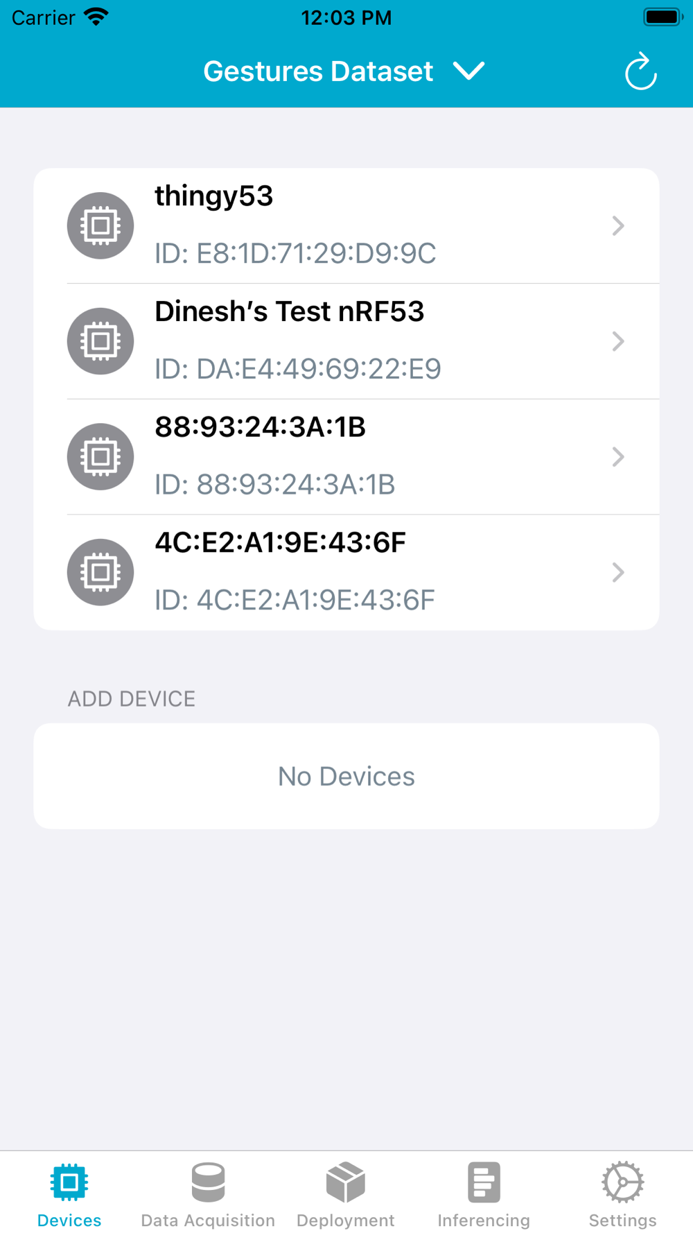 The collected sensor data can be labeled as training or testing data and may be inferenced directly in the app with machine learning model deployed to the Nordic Thingy:53.