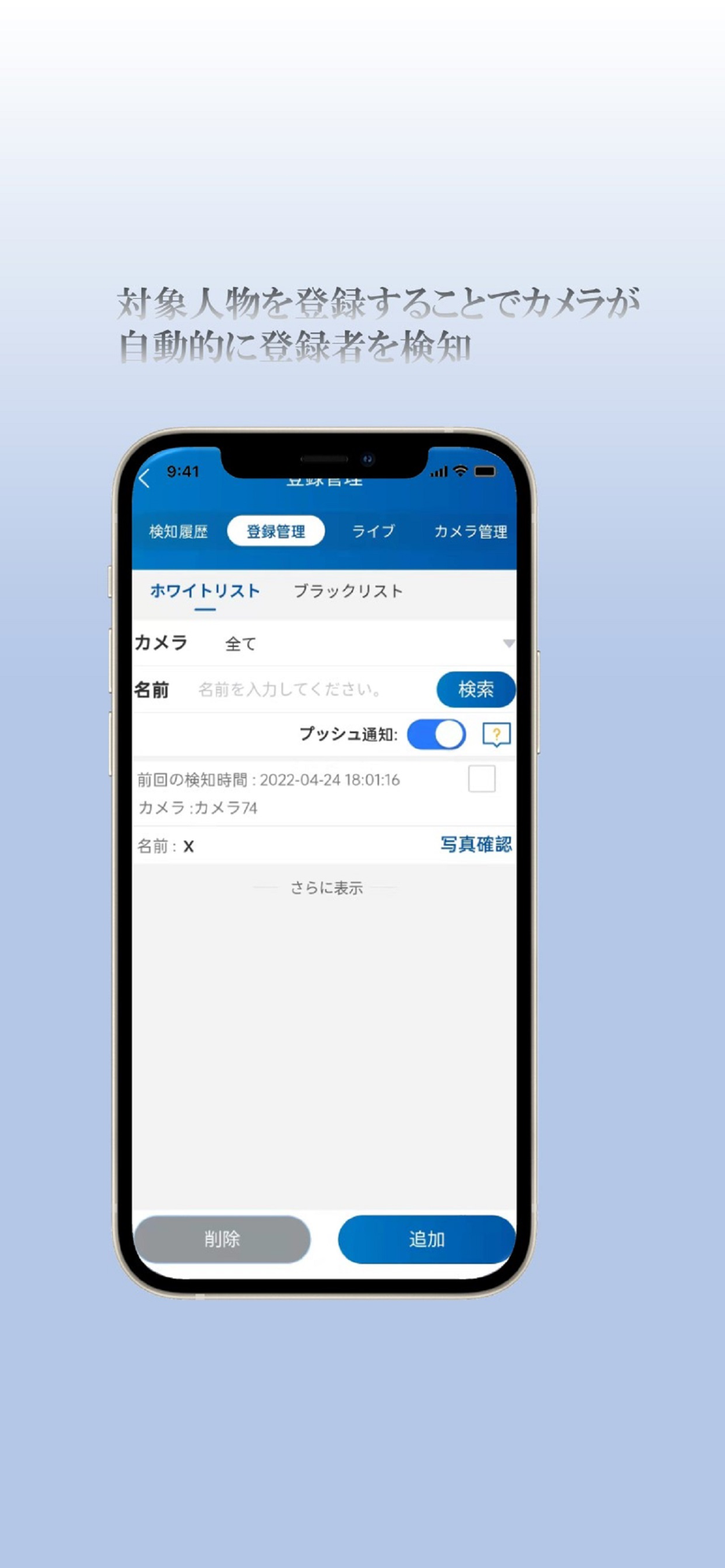 対象人物を登録することでカメラが自動的に登録者を検知し、お使いのスマートフォンへ通知します。認知高齢者の徘徊見守り対策にも、ストーカーやDVなどから身を守り犯罪を未然に防ぐ安全対策としてもご活用いただけます。