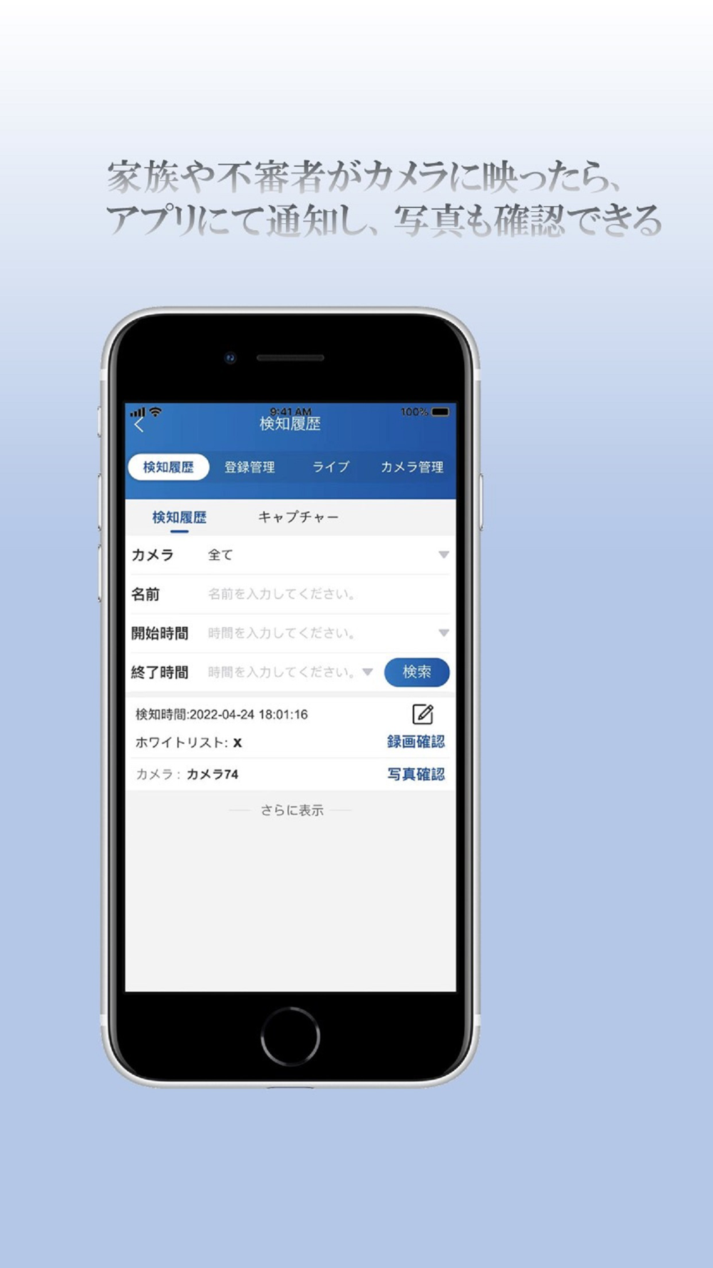 防犯カメラは事前に顔データを登録することでご家族や不審者を特定。「誰がいつ写った」かを把握できます。