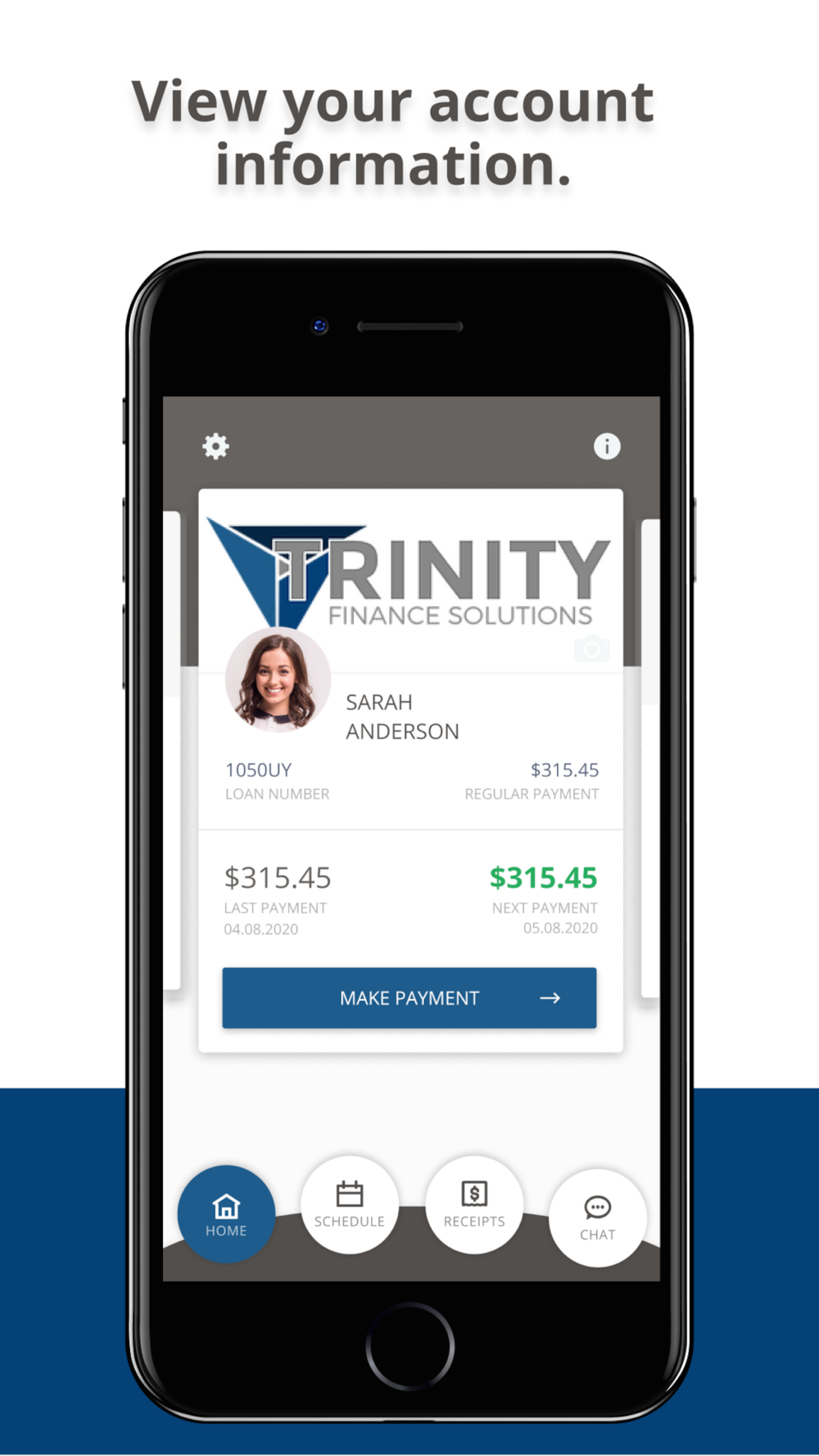 Make and schedule your Trinity Finance payment in real-time. The Trinity Finance App is the easiest way to make your payment, see your payment history, and chat with your provider. It's fast and easy.