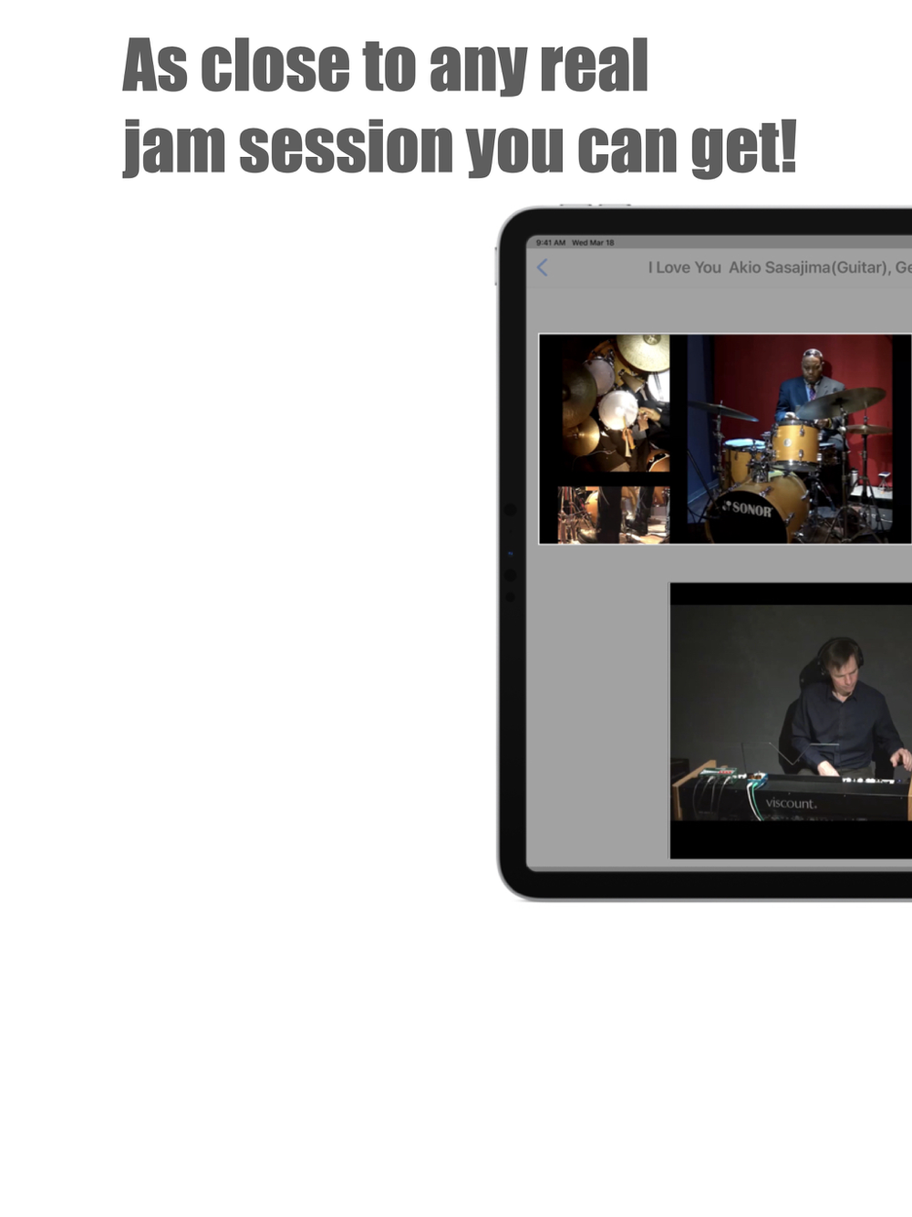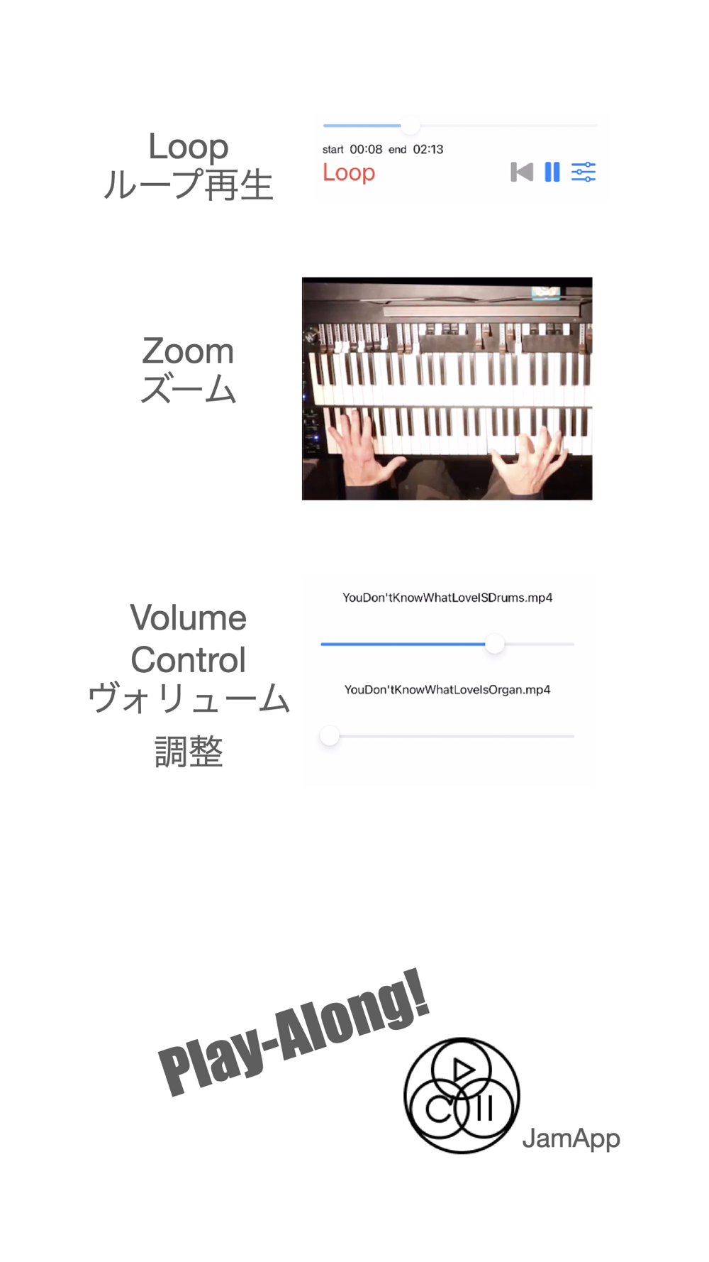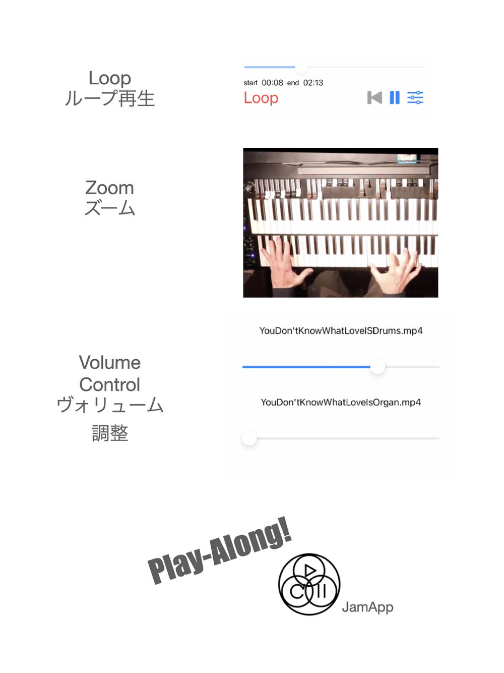 ハイレベルなジャズミュージシャンによる動画音源を、簡単に再生、ポーズ、停止、マイナスワン、ループ操作が出来ます。映像・音源の著作権はJamAppに帰属しますが、練習動画のSNS投稿はどんどん歓迎します。ただし、JamApp映像・音源を使用しての商用作品(アルバムやストリーミング動画)の作成は固くお断りいたします。
