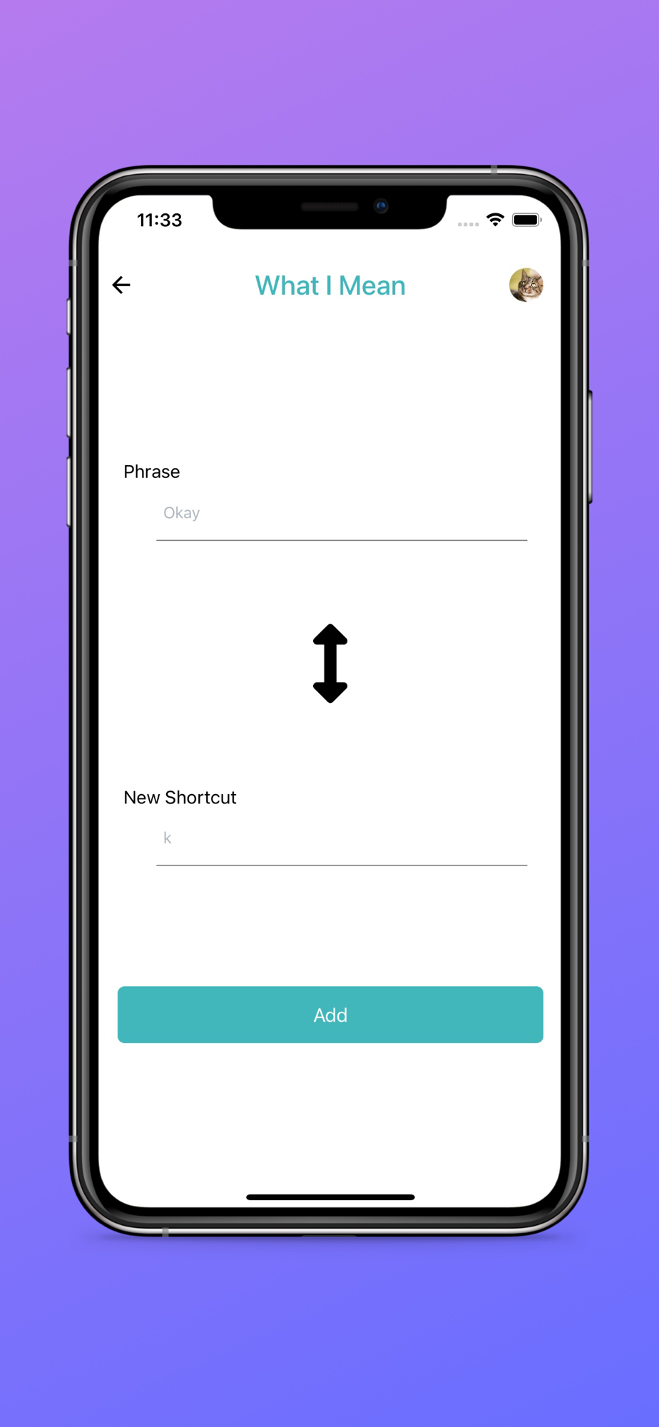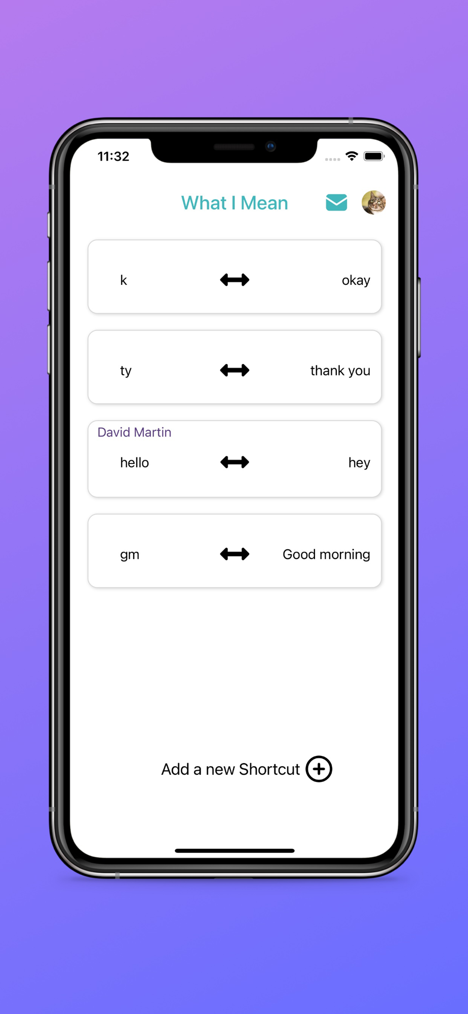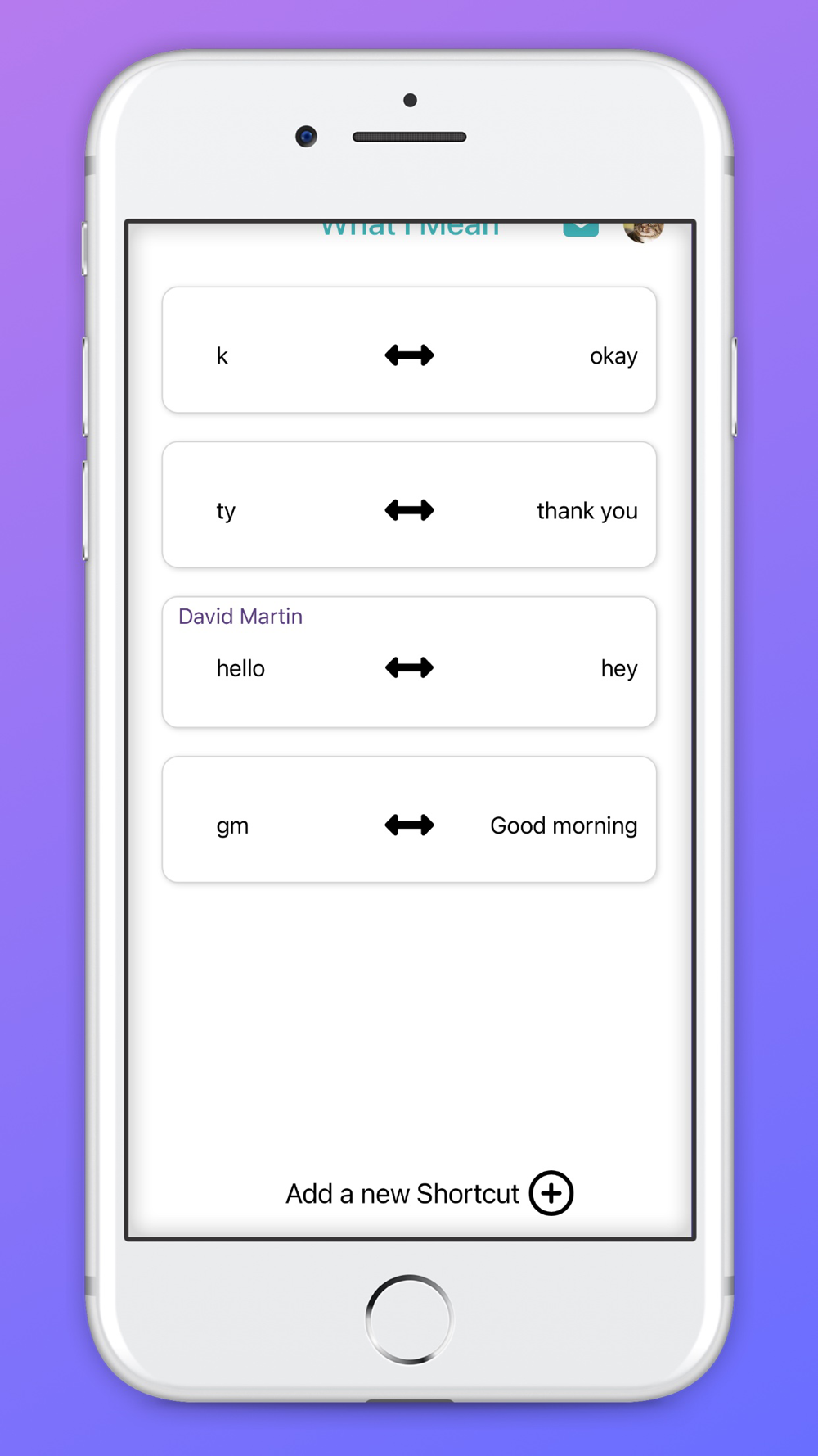 Do you answer with a "K" because you don't have the time to send a thoughtful response? WIM (What I Mean) is the app for you! Set up a personalized response for each shortened answer like "K", and each time you type the shortened answer it will automatically change to the pre-made text. Just imagine the time you'll save!