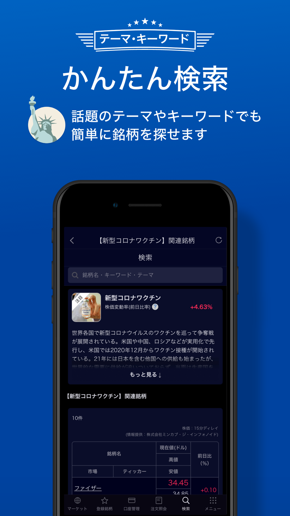 米国株式の情報収集や分析、取引をアプリ上で行えます。
