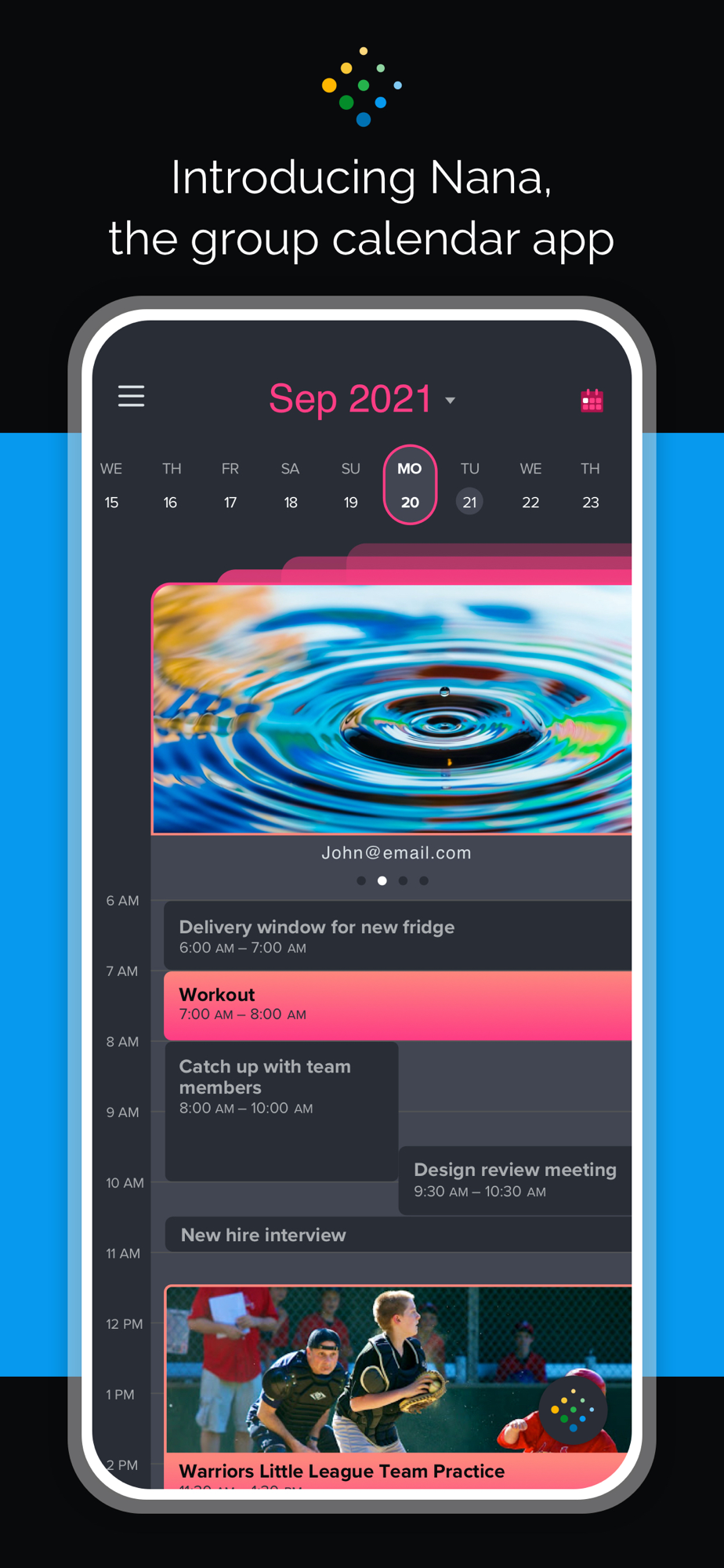 Nana Group Calendar App. Easily coordinate busy calendars with groups of friends, family and contacts. Save your favorite photos across calendars, groups, contacts and events.