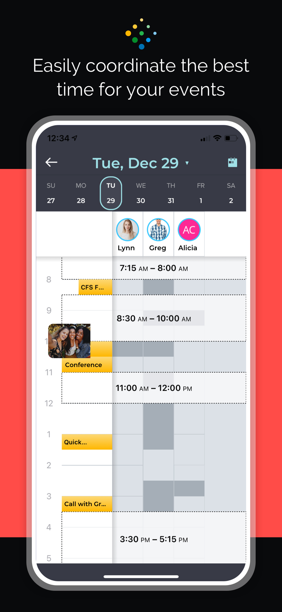 Find the best time to schedule an event. When creating an event, in just a few taps you can easily find an available time for everyone on the invite.